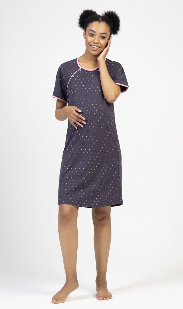 Dámská noční košile mateřská Martina. Dámská noční košile mateřská je svým střihem určená na dobu těhotenství, do porodnice i ke kojení. Ke kojení slouží průstřihy po stranách košile, které jsou uzavíratelné na knoflíky. Látka nočn košile je potištěna jemným puntíčkem. Použitý materiál je jemný a poddajný na dotek. Košile je vhodná na denní nošení.