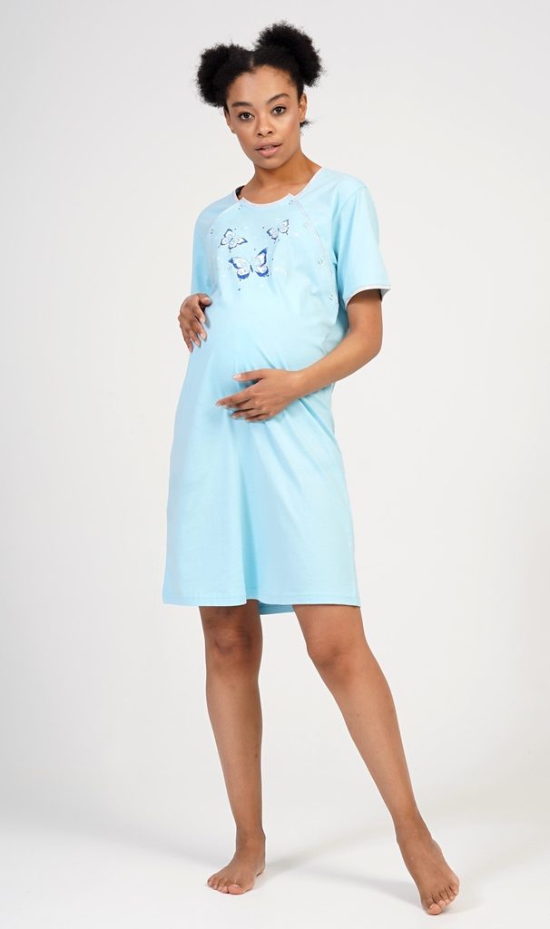 Dámská noční košile mateřská Motýlci. Dámská noční košile slouží svým střihem na dobu těhotenství, do porodnice a ke kojení. Ke kojení slouží průstřihy po stranách noční košile, které jsou uzavíratelné na knoflíky. Na hrudi noční košilky jsou vyobrazeni motýlci, průstřihy, lem a rukávy jsou olemované v kontrastní světlé barvě. Použitý materiál je jemný a poddajný na dotek. Košile je vhodná i na denní nošení.