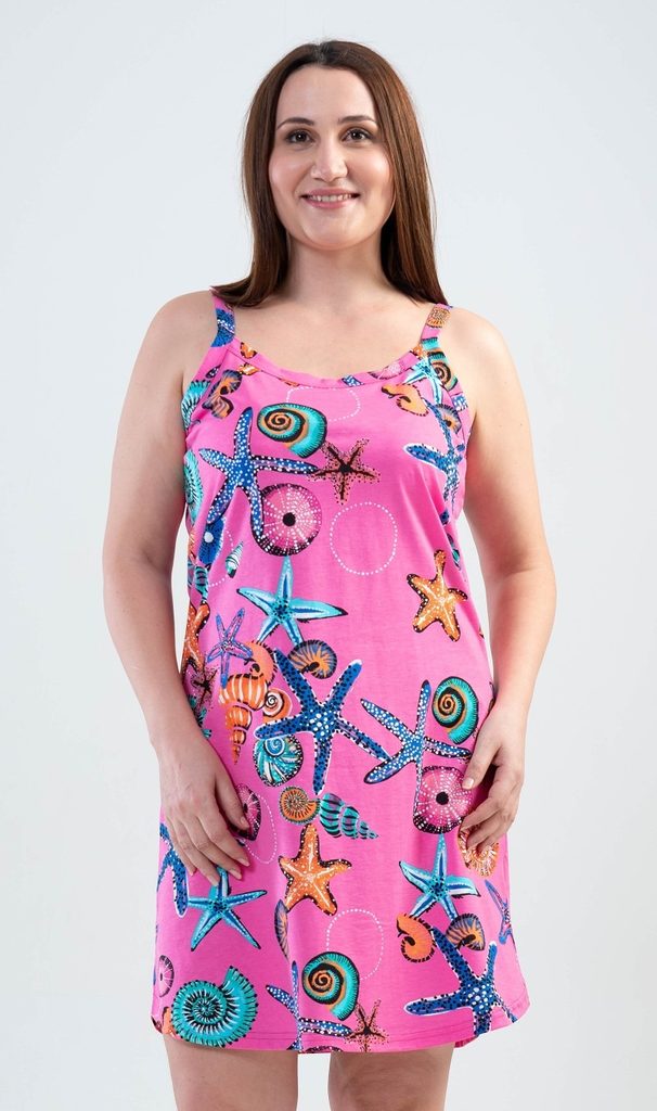 Dámská noční košile na ramínka Moře. Výrazná dámská noční košilka na široká ramínka s potiskem mořských motivů. Použitý materiál je jemný a poddajný na dotek. Košile je vhodná na denní nošení.