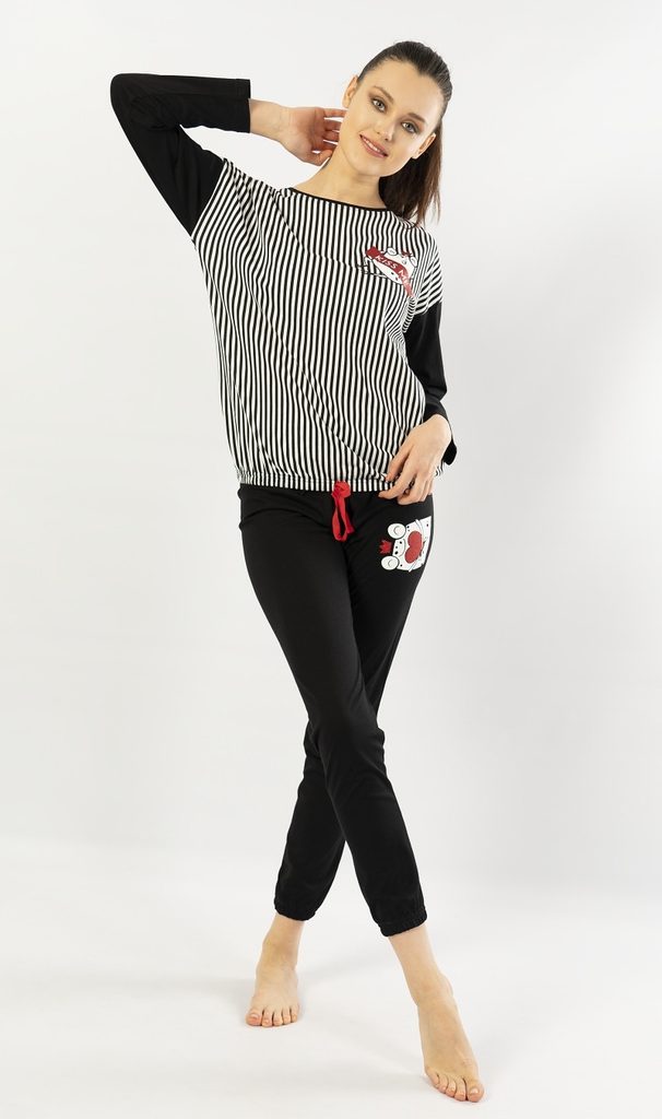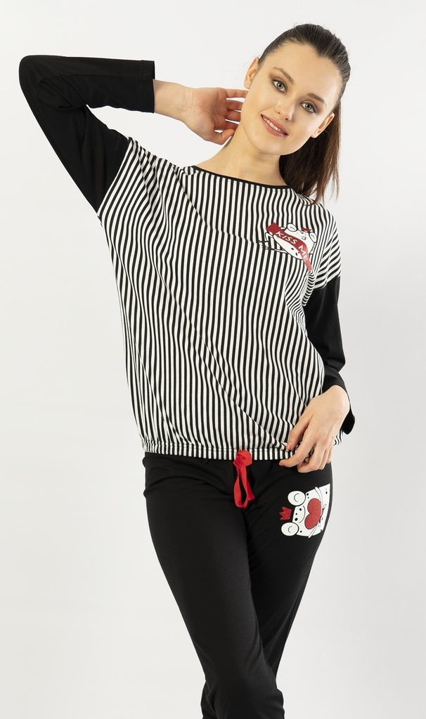 Dámské dlouhé pyžamo Kiss me. Dámské pyžamo se skládá z trička s dlouhým rukávem a dlouhých kalhot. Barevně oddělené rukávy trička tvoří iluzi vrstvení, kdy navrchu je pruhované tričko s krátkým rukávem a vespod černé tričko. Kalhoty jsou jednobarevné s potiskem žabáka, který se objevuje i na tričku. V pase kalhot je červená šňůrka na stažení. Pyžamo je vyrobené ze 100% bavlny, která je měkká a poddajná na dotek.