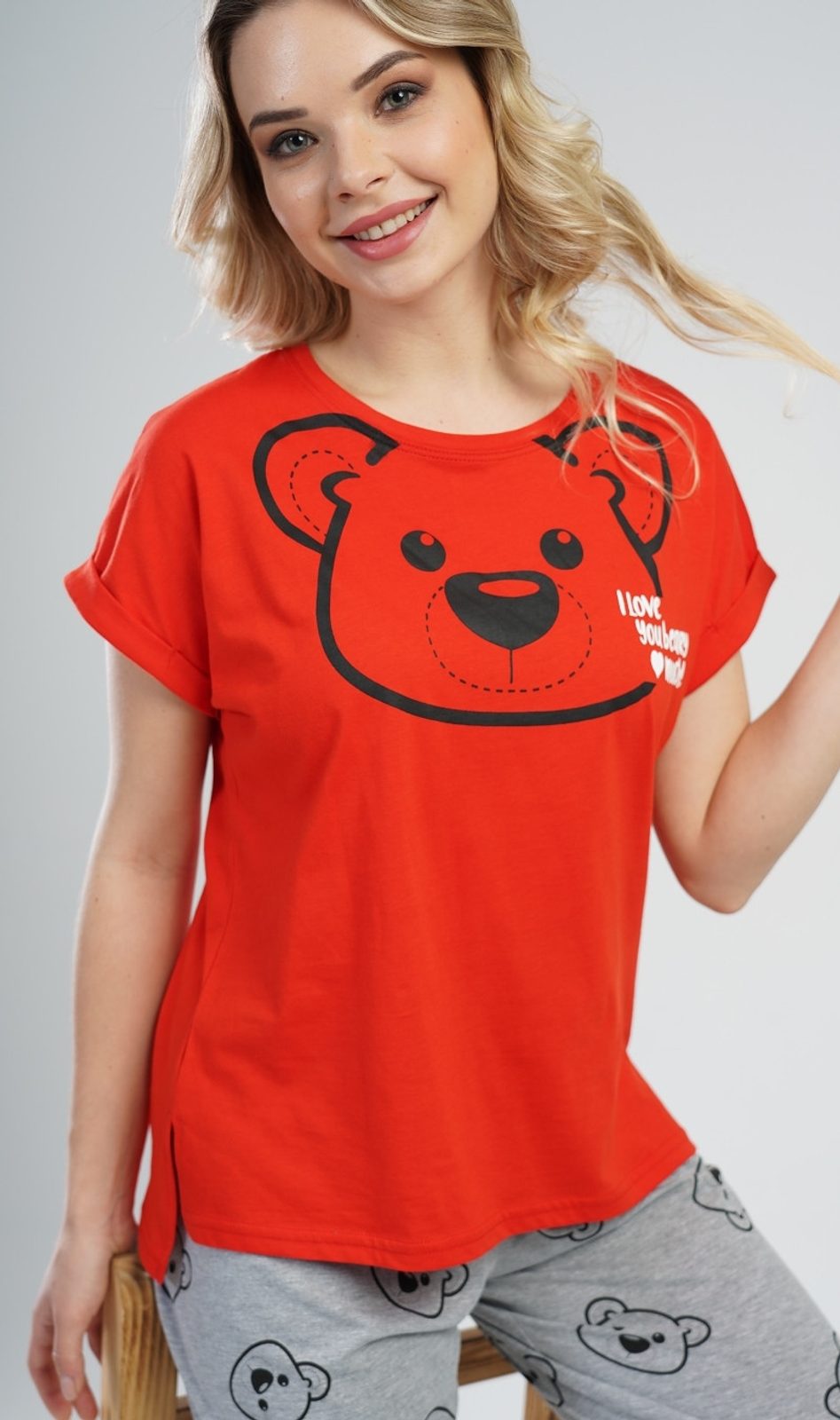 Dámské pyžamo s krátkým rukávem Méďa. Dámské pyžamo se skládá z trička s krátkým rukávem a dlouhých kalhot. Tričko má kulatý výstřih a červenou barvu s potiskem hlavičky medvídka na hrudi. Motiv medvídka se opakuje i na dlouhých šedých kalhotách. Použitý materiál je příjemný na těle.