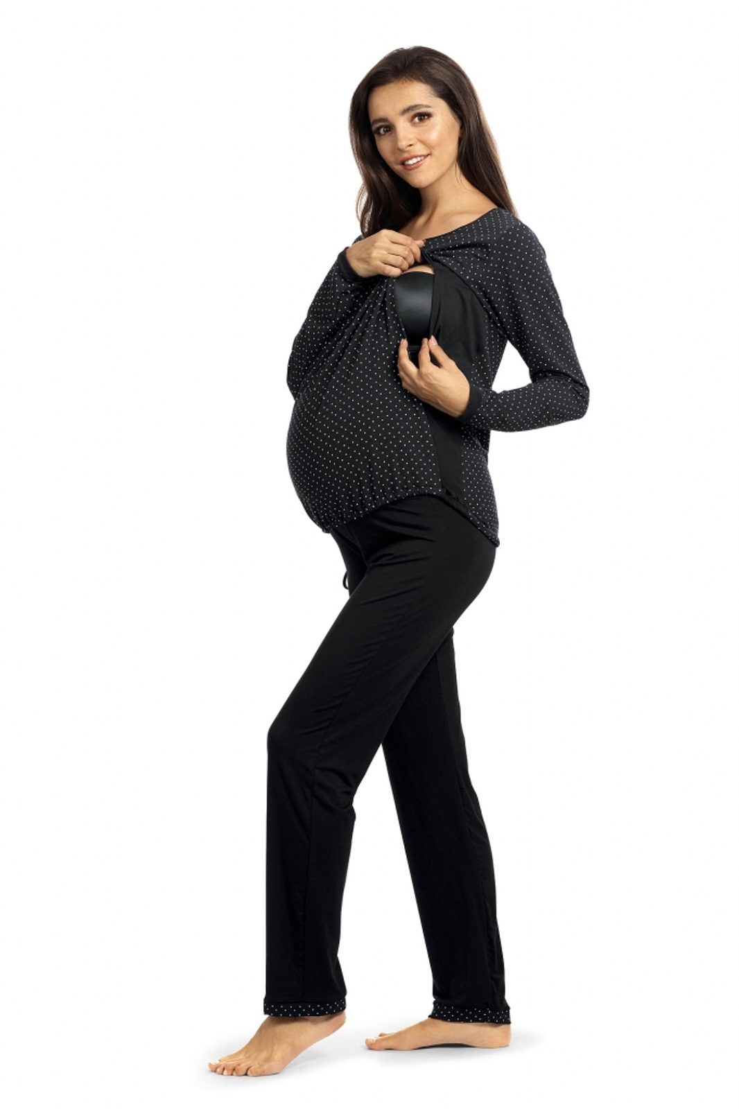 Praktické kojící pyžamo pro ženy v období mateřství i těhotenství. Dvoudílné pyžamo je složené z dlouhých hladkých kalhot a trička s puntíkovaným motivem a dlouhým rukávem. Tričko má postranní průstřihy pro snadné a pohodlné kojení v noci i přes den.