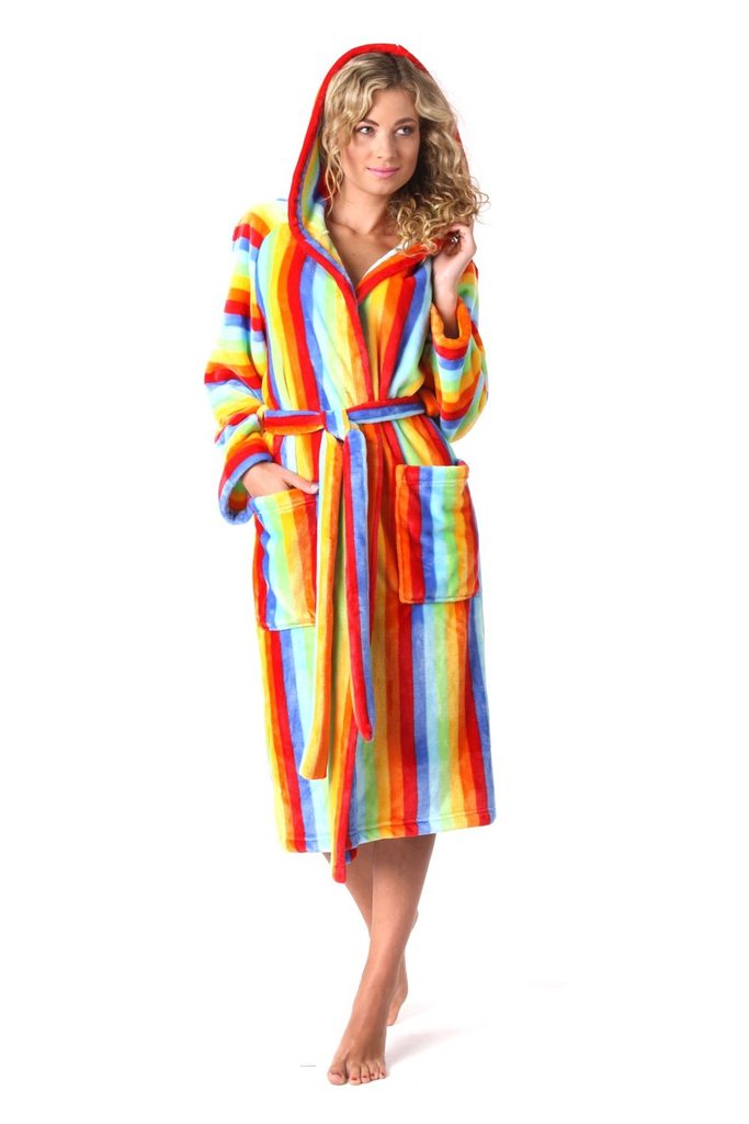Pruhovaný dámský župan v pestrých duhových barvách. Župan má delší střih s páskem na zavazování v pase. Má dvě větší praktické kapsy a kapuci pro ještě větší pohodlí. Župan je kvalitně zpracován a má lehký, měkký materiál s krátkým hustým vlasem. Působí hravým, mladistvým dojmem. V naší nabídce je k dispozici i v krátkém nebo dětském provedení.