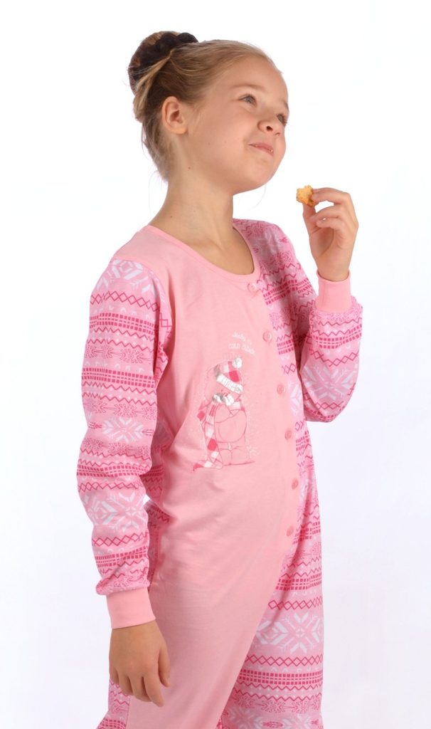Dětský overal Méďa s čepicí. Overal je celopropínací z jedné strany zdobený potiskem medvídka, z druhé strany celoplošným norským vzorem. Dlouhé nohavice jsou ukončeny elastickými lemy. Bavlněný materiál je poddajný a jemný na dotek. Pyžamo je vhodné i na denní nošení.