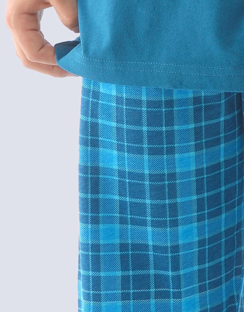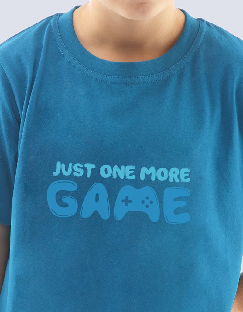 Modré chlapecké pyžamo. Chlapecké pyžamo se skládá z trička s dlouhým rukávem a dlouhých kalhot. Tričko je jednobarevné s nápisem Just one more game na hrudi. Tričko doplňují kárované kalhoty. Pyžamo je vyrobené z kvalitní bavlny, která je jemná a měkká na dotek.