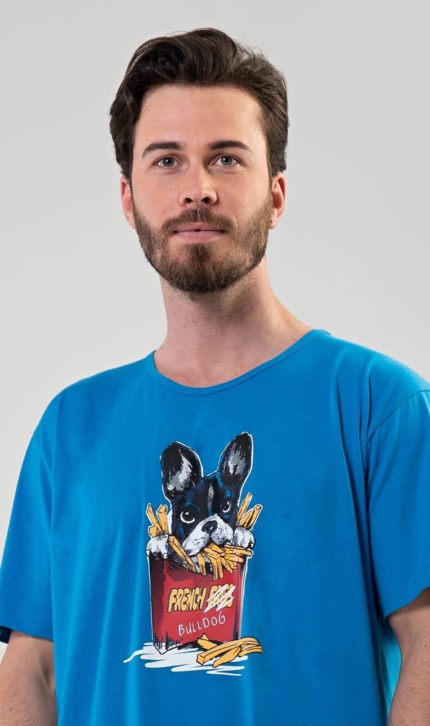 Pánská noční košile s krátkým rukávem Bulldog. Pánská noční košile má na přední straně vtipný obrázek bulldoga v hranolkách. Je vyrobená z kvalitní bavlny, která je pohodlná a příjemná na dotek. Košile je vhodná na denní nošení.