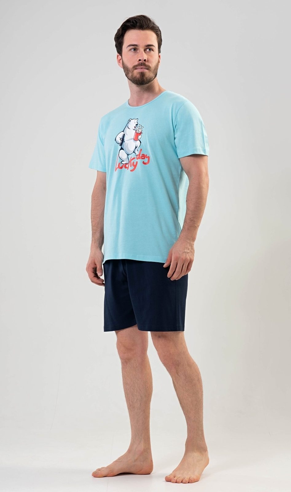 Pánské pyžamo Lucky day. Pánské pyžamo se skládá z trička s krátkým rukávem a šortek. Tričko má světle modrou barvu a na přední straně obrázek ledního medvěda. Šortky jsou jednobarevné. Pyžamo je vyrobené z kvalitního materiálu, který je pohodlný a příjemný na dotek.