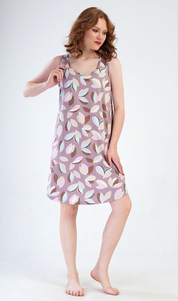 Dámská bavlněná noční košile na ramínka Klárka. Noční košile se širšími ramínky a kulatým výstřihem je potištěna listy. Použitý materiál s obsahem bavlny 100% je příjemný a poddajný na dotek. Košile je vhodná i na denní nošení, obvzlášť v horkých letních dnech.