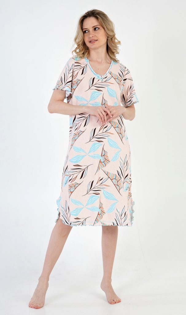 Dámská noční košile s krátkým rukávem Melissa. Dámská noční košilka pro všechny milovníky retra a starých časů s příjemnou délkou pod kolena a ozdobným žlábkováním kolem výstřihu, rukávů a spodního lemu, který je ozvláštněn rozparkem. Na látce košile jsou natištěny florální motivy s větvičkami. Použitý bavlněný materiál je jemný a poddajný na dotek.