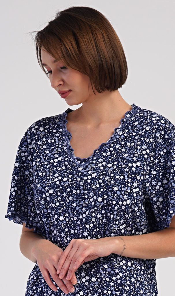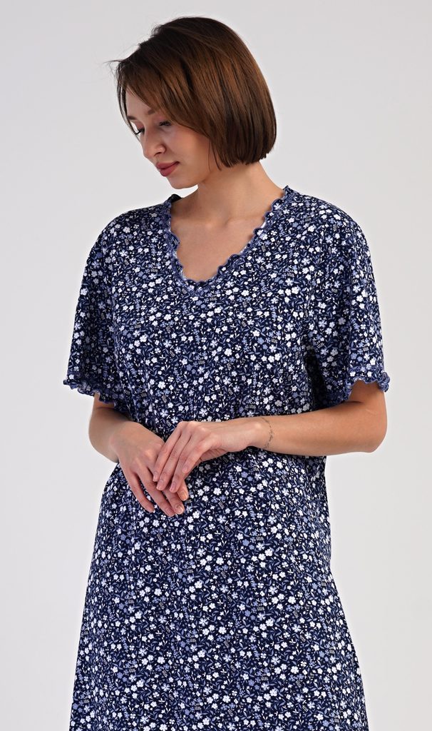 Dámská bavlněná noční košile s krátkým rukávem Miriam. Dámská noční košile má příjemnou délkou pod kolena a ozdobné žlábkování okolo výstřihu, rukávů a spodního lemu. Košile s krátkým rukávem je potištěna drobnými květy. Použitý materiál s podílem bavlny 100% je příjemný a poddajný na dotek.