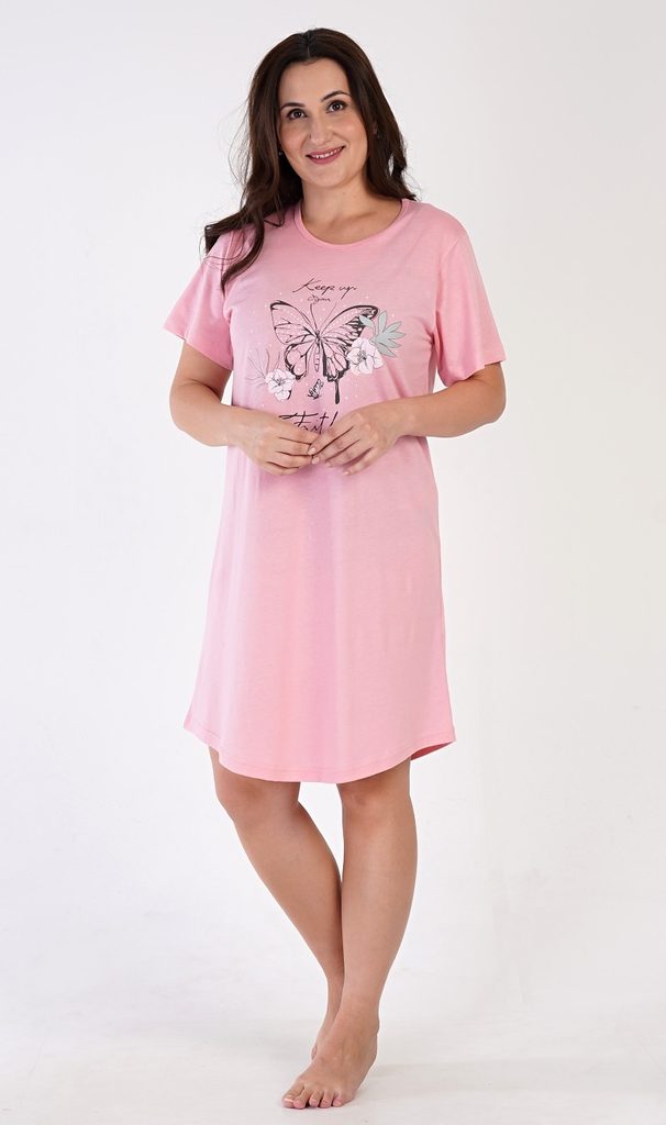 Dámská bavlněná noční košile s krátkým rukávem Motýl. Dámská noční košile s kulatým výstřihem je jednobarevná, na hrudi má nápis 'Keep up your faith' a obrázek motýla. Použitý materiál s obsahem bavlny 100% je příjemný a poddajný na dotek.