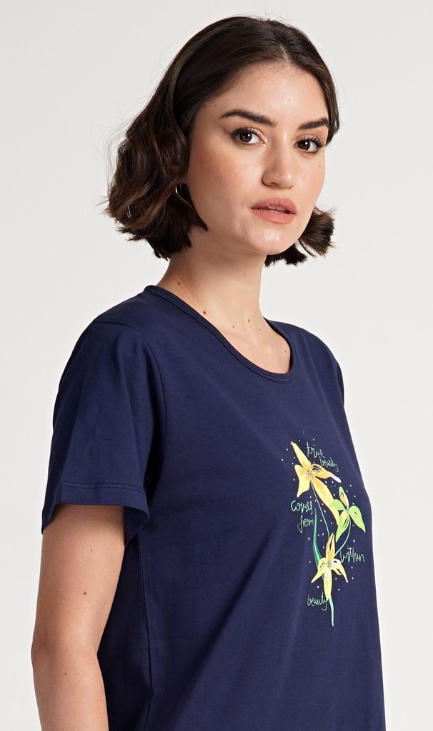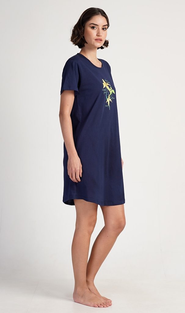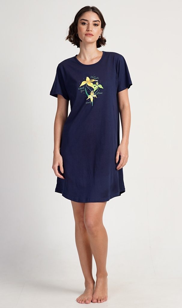 Dámská bavlněná noční košile s krátkým rukávem Paula. Noční košile s kulatým výstřihem a příjemnou délkou nad kolena má na hrudi obrázek exotických květů a drobné nápisy. Použitý materiál s obsahem bavlny 100% je příjemný a poddajný na dotek.