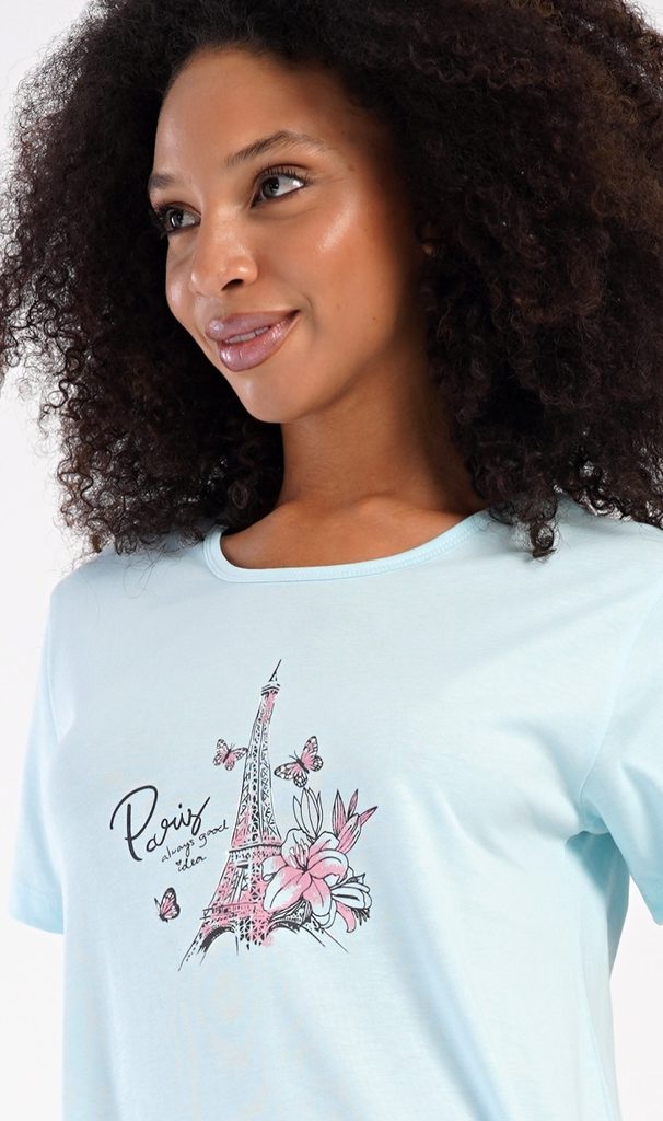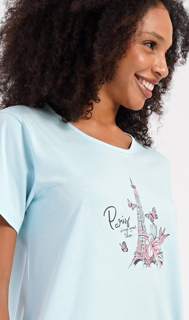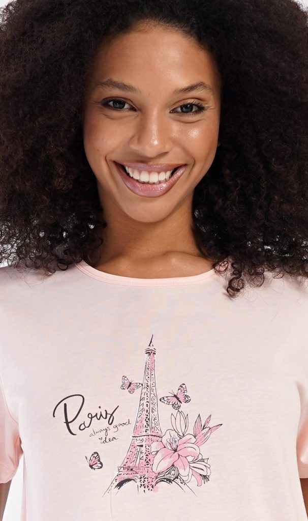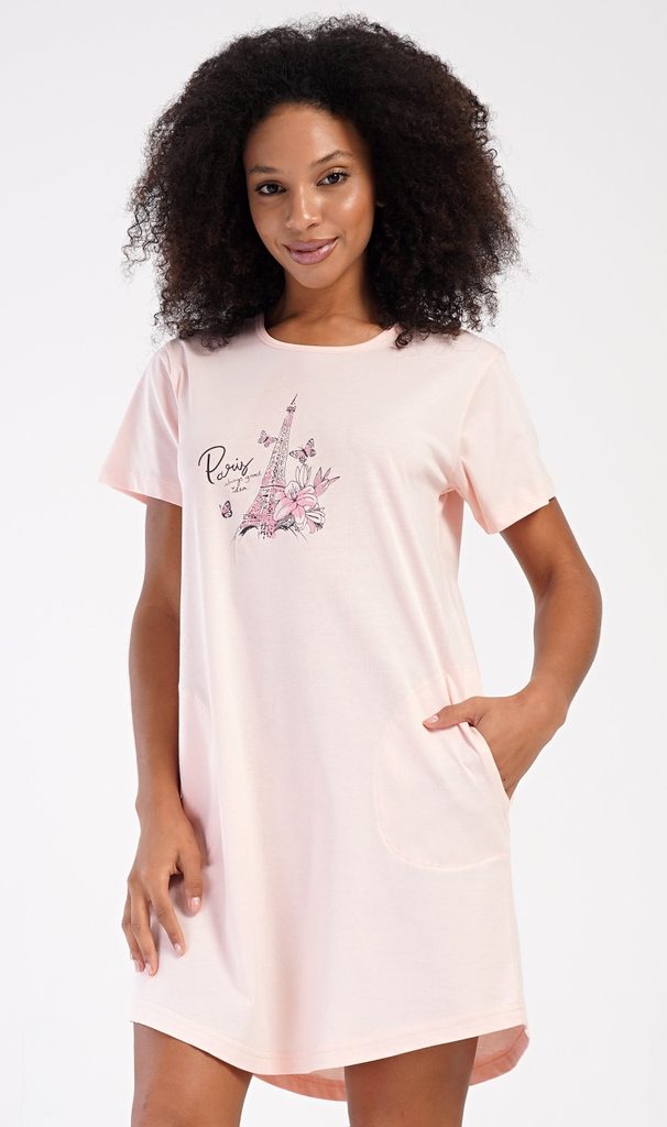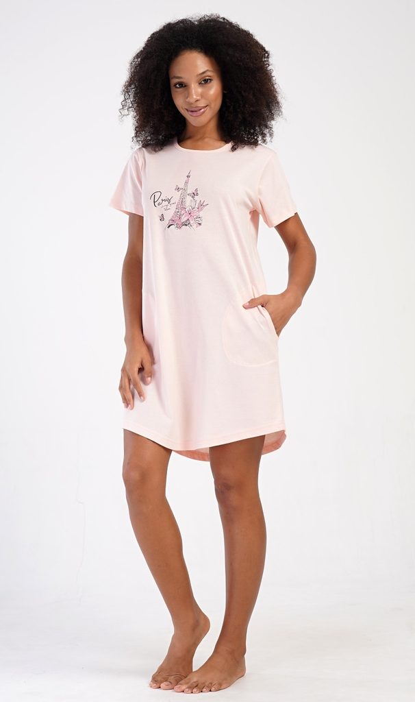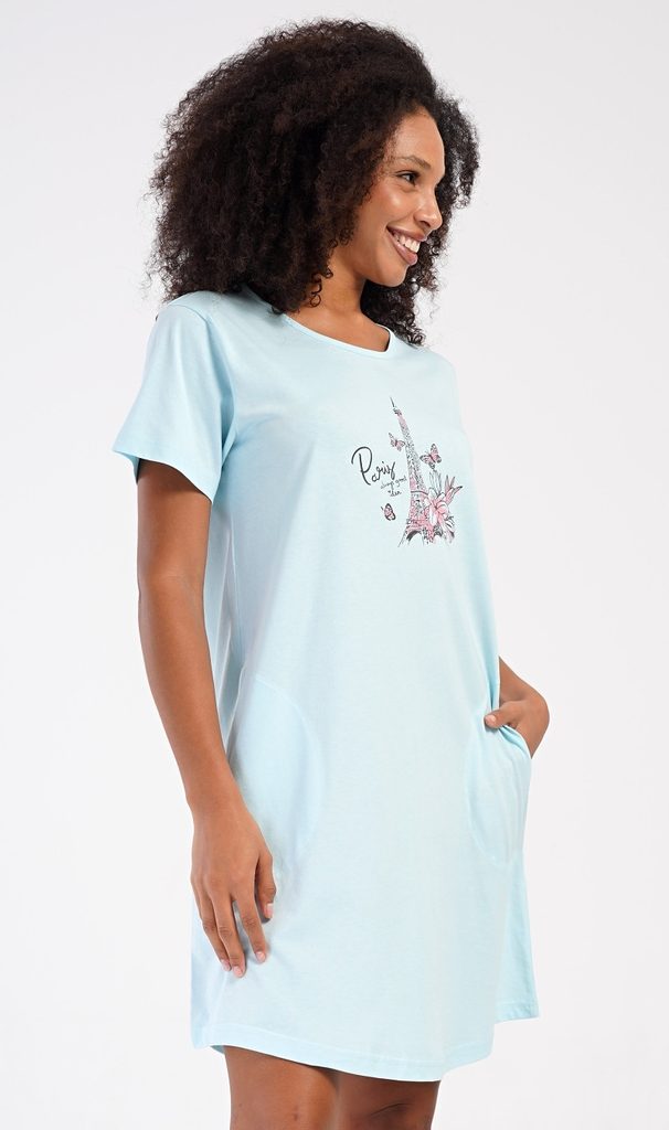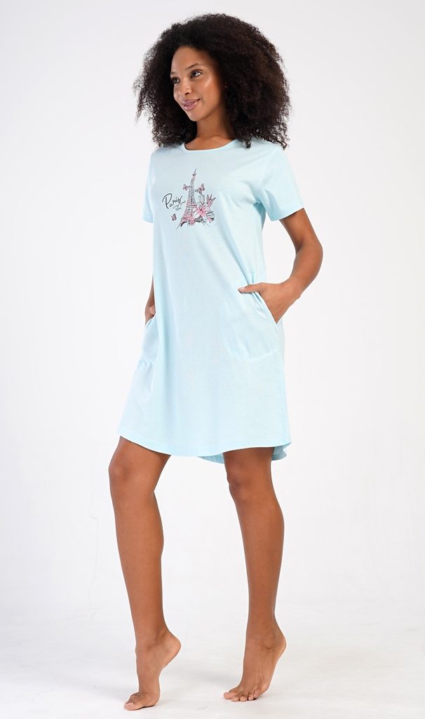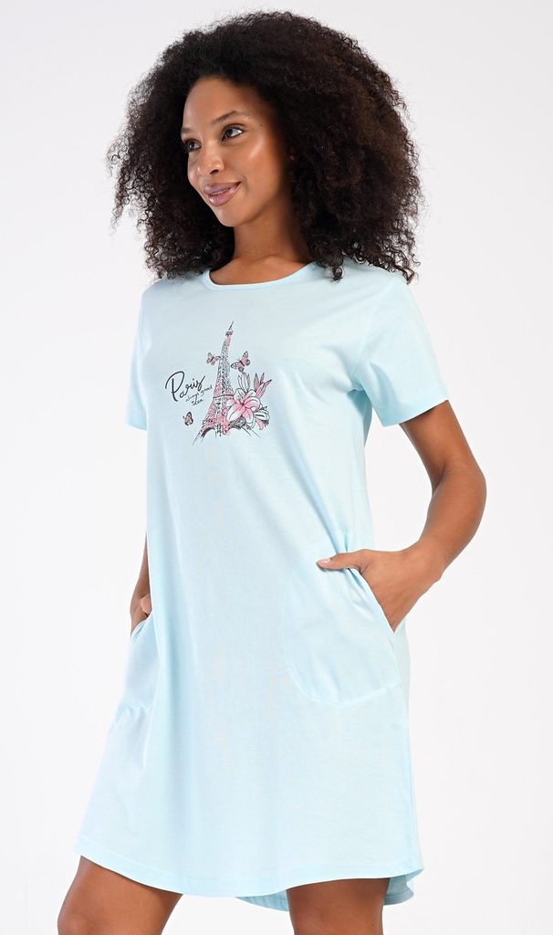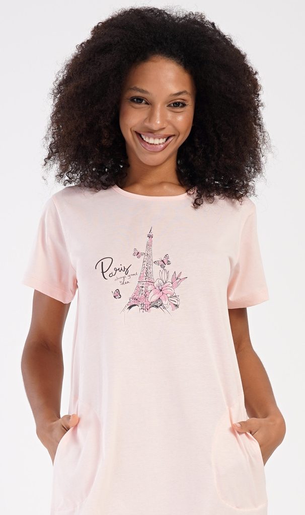 Dámské bavlněné domácí šaty s krátkým rukávem Paris. Domácí jednobarevné šaty s kulatým výstřihem a kapsami zdobí na hrudi obrázek Eiffelovy věže a nápis Paris. Použitý bavlněný materiál je příjemný a poddajný na dotek. Šaty jsou pohodlné, využijete je téměř při všech volnočasových aktivitách. Jsou vhodné na spaní i na denní nošení.