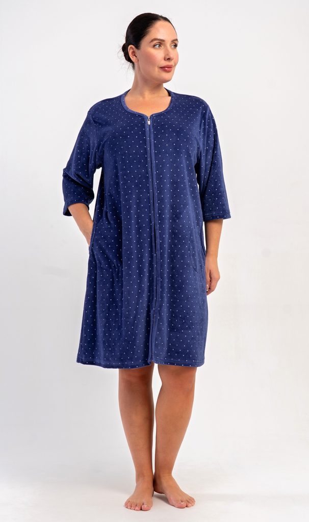 Dámské sametové domácí šaty s tříčtvrtečním rukávem Alex. Pohodlné rozepínací šaty v příjemné délce pod kolena využijete téměř při všech volnočasových aktivitách. Mají praktické kapsy a zapínání na zip. Použitý velurový materiál s obsahem bavlny 80% je příjemný a poddajný na dotek.
