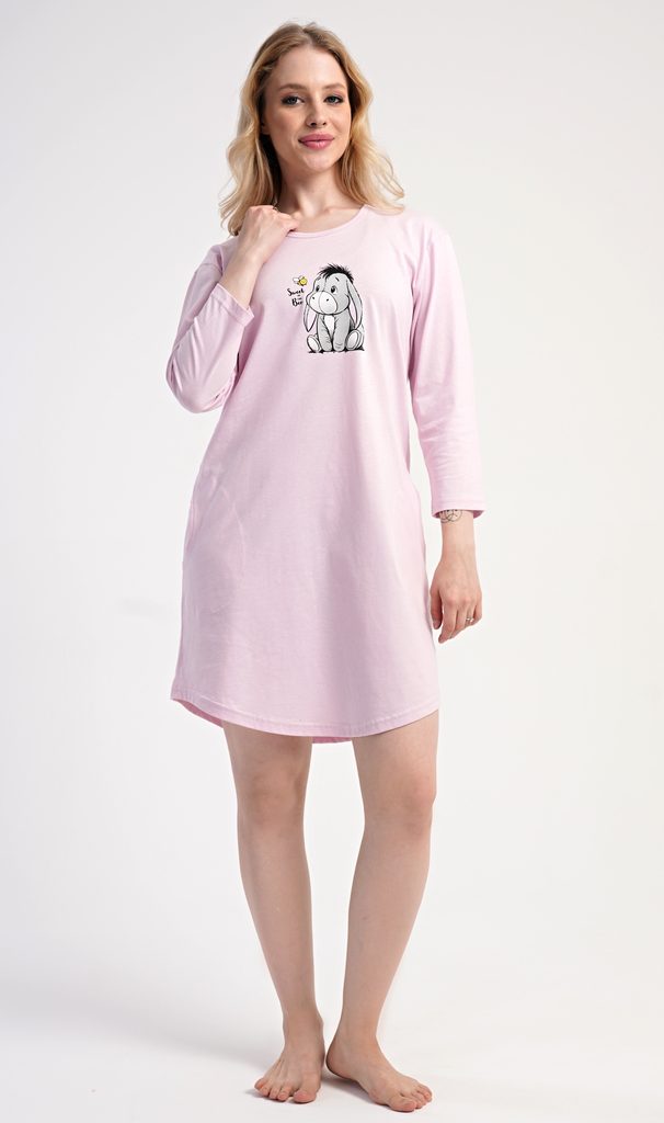 Dámské bavlněné domácí šaty s tříčtvrtečním rukávem Oslík. Domácí bavlněné šaty s kulatým výstřihem mají praktické kapsy a zdobí je na hrudi obrázek oslíka. Použitý bavlněný materiál je příjemný a poddajný na dotek.