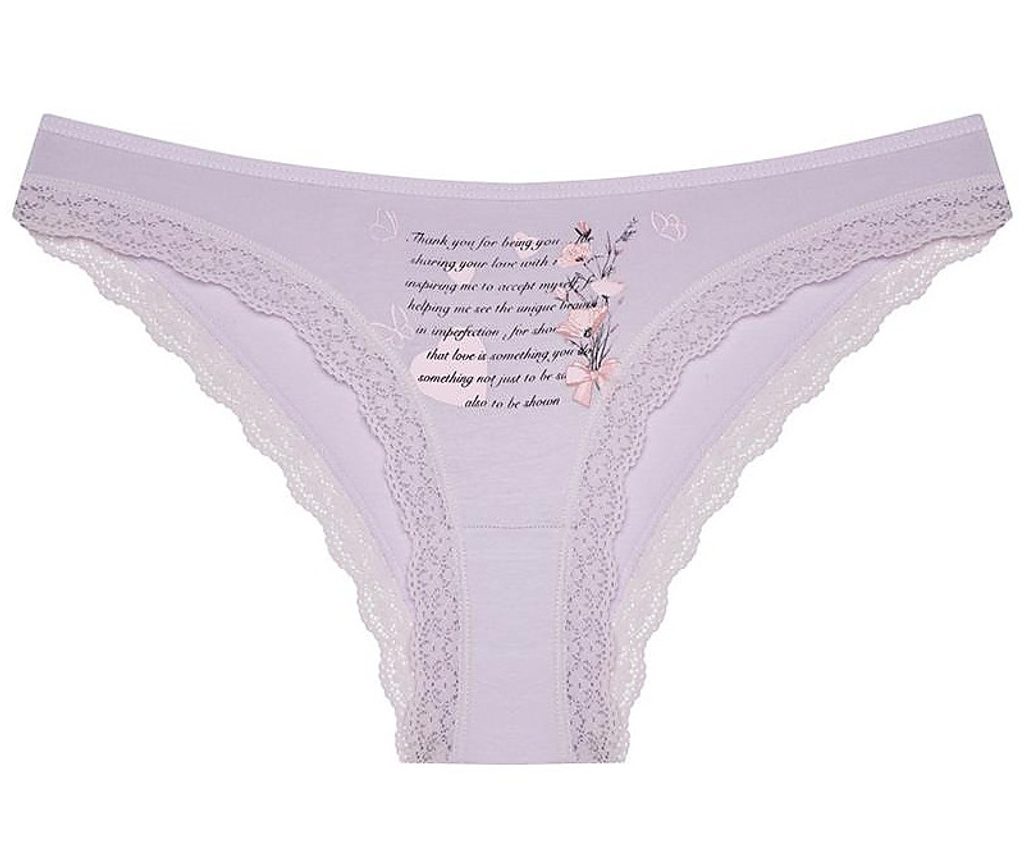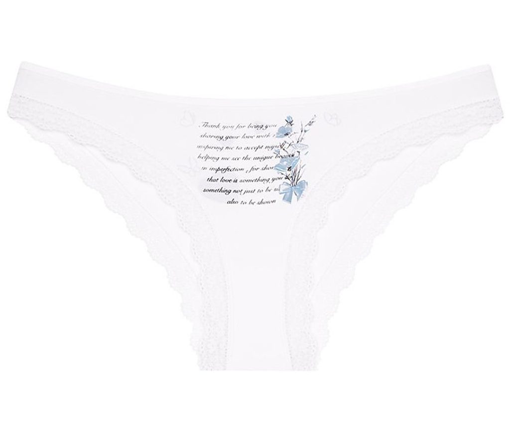 Dámské kalhotky Denisa. Dámské kalhotky klasického střihu jsou ozdobeny krajkou a drobným romantickým potiskem. Použitý materiál je příjemný a poddajný na dotek.