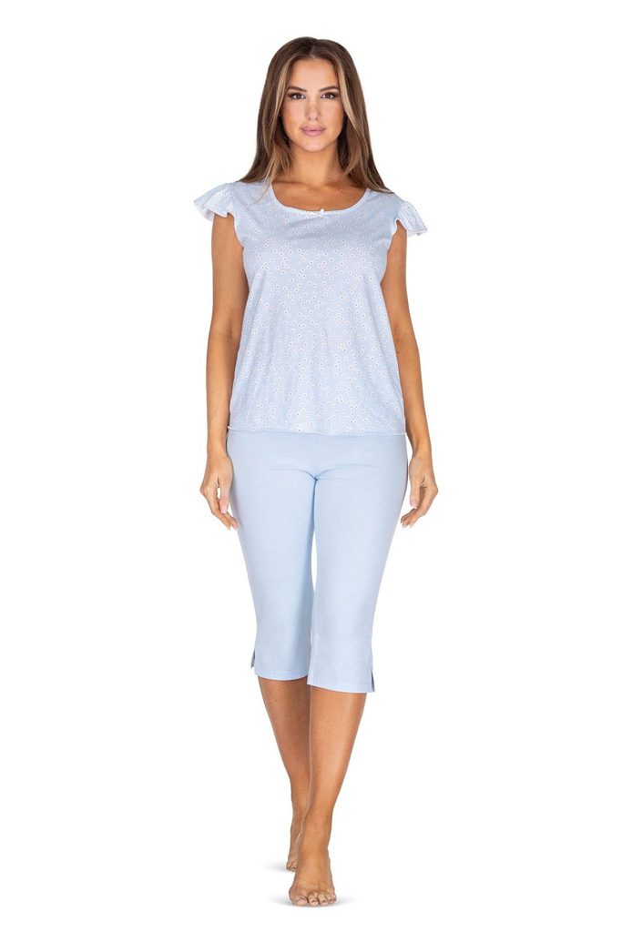 Dámské pyžamo 633 Regina - vyrobené z velmi kvalitní bavlny - tričko světle modré barvy bez rukávů - se vzorem - pohodlné meruňkové capri kalhoty mají v pase gumu - vhodné i na běžné denní nošení