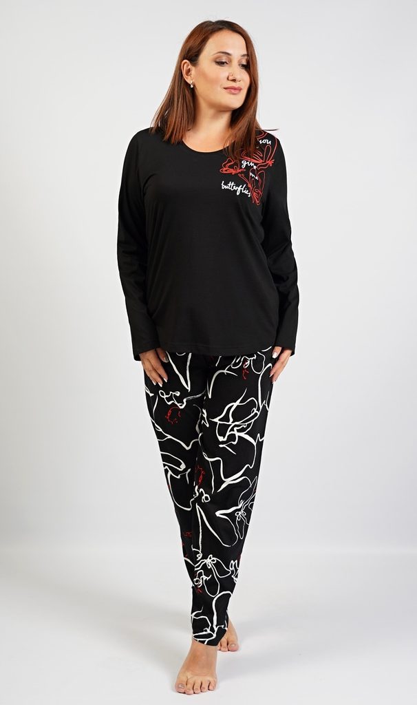 Dámské pyžamo dlouhé Butterfly. Dámské pyžamo dlouhé se skládá z trika s dlouhým rukávem a dlouhých kalhot. Na jednobarevném černém triku je potisk červených motýlů a bílý nápis. Kalhoty mají v pase gumu a šňůrku na stažení, jsou bez kapes. Použitý materiál je jemný a poddajný na dotek.