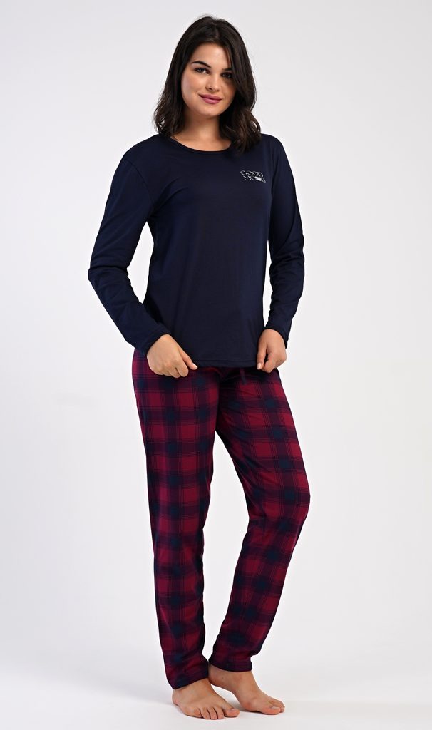Dámské bavlněné dlouhé pyžamo Emma. Dámské pyžamo se skládá z trika s dlouhým rukávem a dlouhých kalhot. Jednobarevné triko s kulatým výstřihem zdobí na hrudi drobný nápis. Kárované kalhoty mají v pase gumu a šňůrku na stažení, nemají kapsy. Použitý bavlněný materiál je poddajný a příjemný na dotek.