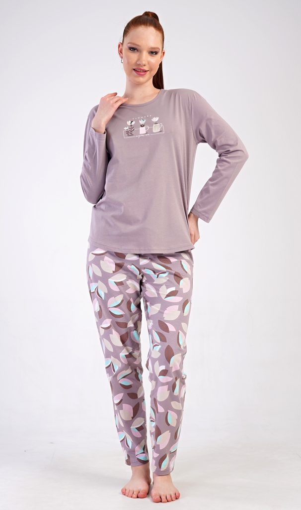 Dámské bavlněné dlouhé pyžamo Karla. Dámské pyžamo se skládá z trika s dlouhým rukávem a dlouhých kalhot. Jednobarevné triko je ozdobeno obrázkem květů. Tento motiv se opakuje i na kalhotách, které mají v pase gumu a šňůrku na stažení, nemají kapsy. Použitý bavlněný materiál je poddajný a příjemný na dotek.