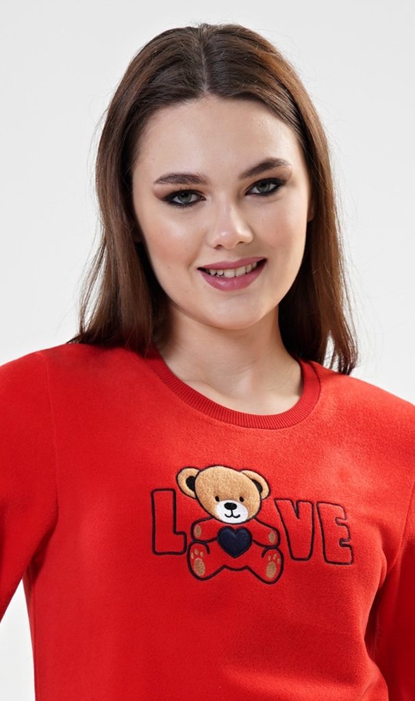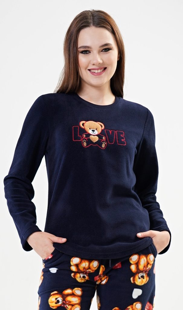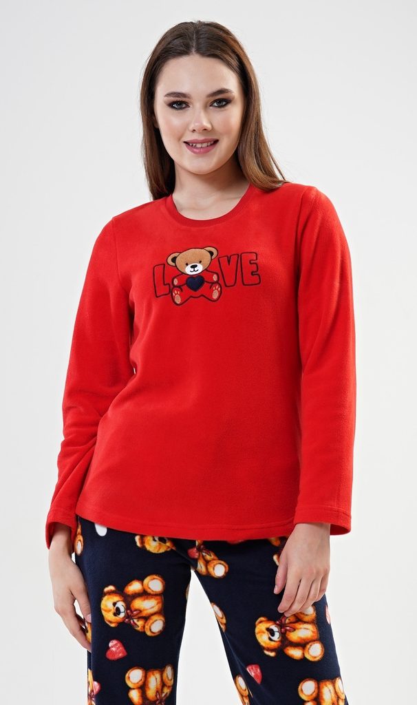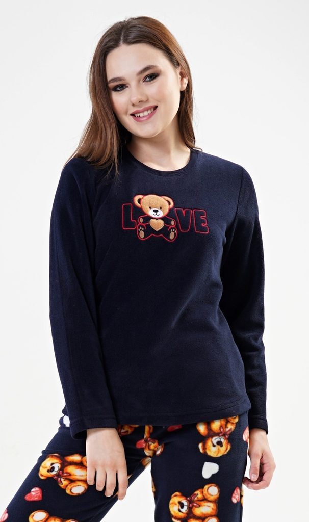 Dámské pyžamo dlouhé polarové Love. Dámské pyžamo se skládá z trika s dlouhým rukávem a dlouhých kalhot. Triko je ozdobené aplikací - obrázkem plyšového medvídka a nápisem LOVE. Polarový materiál je hřejivý a hebký na dotek. Kalhoty jsou potištěné obrázky plyšových medvědů. Kalhoty jsou do gumy, na stažení šňůrkou a mají kapsy, také jsou vyrobeny z polaru.