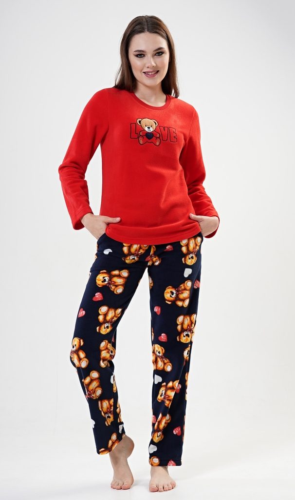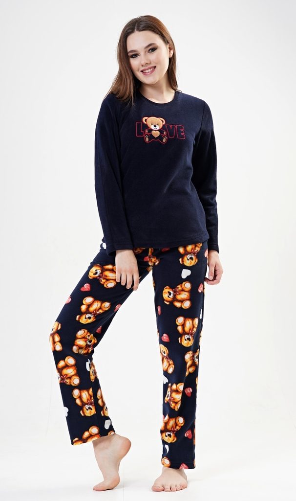 Dámské pyžamo dlouhé polarové Love. Dámské pyžamo se skládá z trika s dlouhým rukávem a dlouhých kalhot. Triko je ozdobené aplikací - obrázkem plyšového medvídka a nápisem LOVE. Polarový materiál je hřejivý a hebký na dotek. Kalhoty jsou potištěné obrázky plyšových medvědů. Kalhoty jsou do gumy, na stažení šňůrkou a mají kapsy, také jsou vyrobeny z polaru.