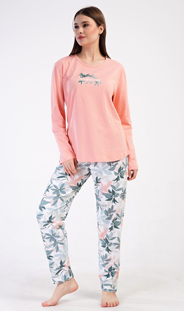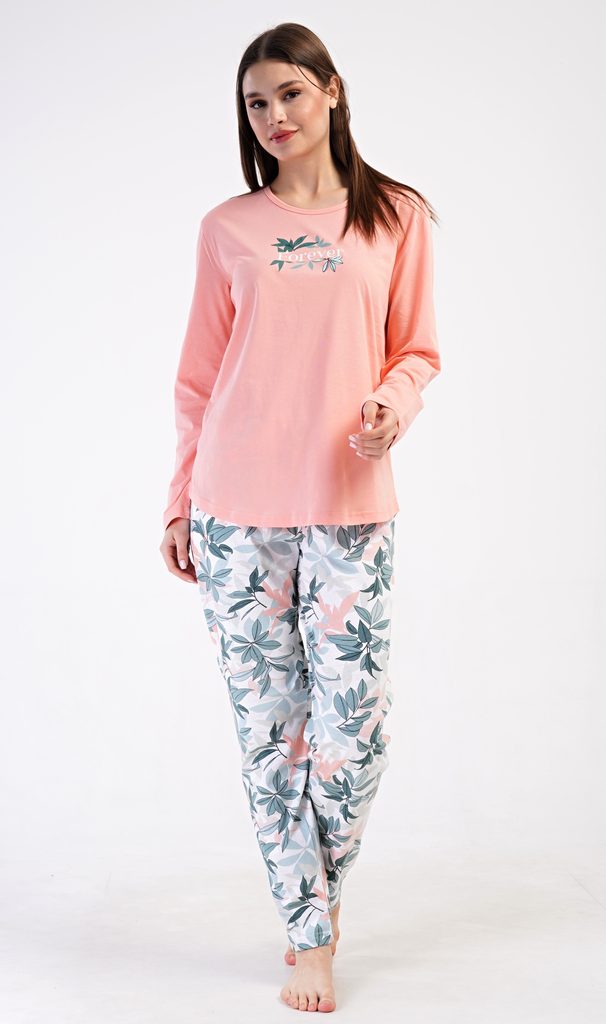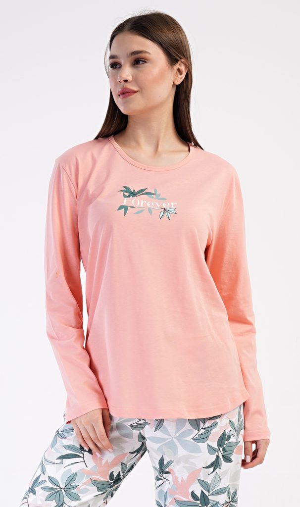Dámské bavlněné dlouhé pyžamo Melinda. Dámské pyžamo se skládá z trika s dlouhým rukávem a dlouhých kalhot. Triko je jednobarevné, zdobené na hrudi drobným obrázkem větviček a nápis 'Forever'. Motiv větviček se opakuje i na kalhotách, které mají v pase gumu a šňůrku na stažení, nemají kapsy. Použitý bavlněný materiál je poddajný a příjemný na dotek.