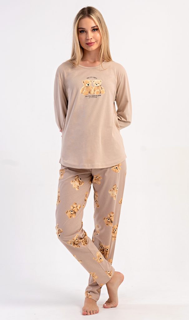 Dámské bavlněné dlouhé pyžamo Monika. Dámské pyžamo se skládá z trika s dlouhým rukávem a dlouhých kalhot. Triko s kulatým výstřihem je na hrudi zdobeno obrázkem plyšových medvědů. Tento motiv se opakuje i na kalhotách, které mají v pase gumu a šňůrku na stažení, nemají kapsy. Použitý bavlněný materiál je poddajný a příjemný na dotek.
