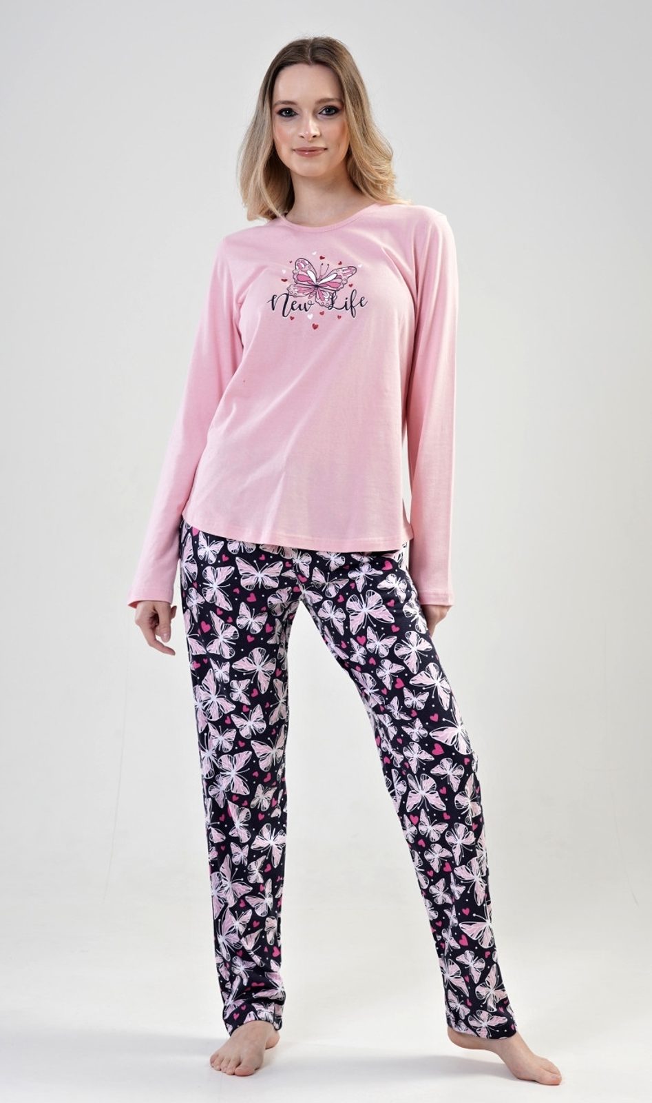 Dámské bavlněné pyžamo dlouhé Motýlci. Dámské pyžamo se skládá z trička s dlouhým rukávem a dlouhých kalhot. Triko je jednobarevné, zdobené obrázkem motýla nápisem New life. Kalhoty jsou tmavě šedé, s potiskem motýlů a srdíček. Kalhoty jsou do gumy, na stažení šňůrkou a mají kapsy. Použitý materiál je poddajný a jemný na dotek.