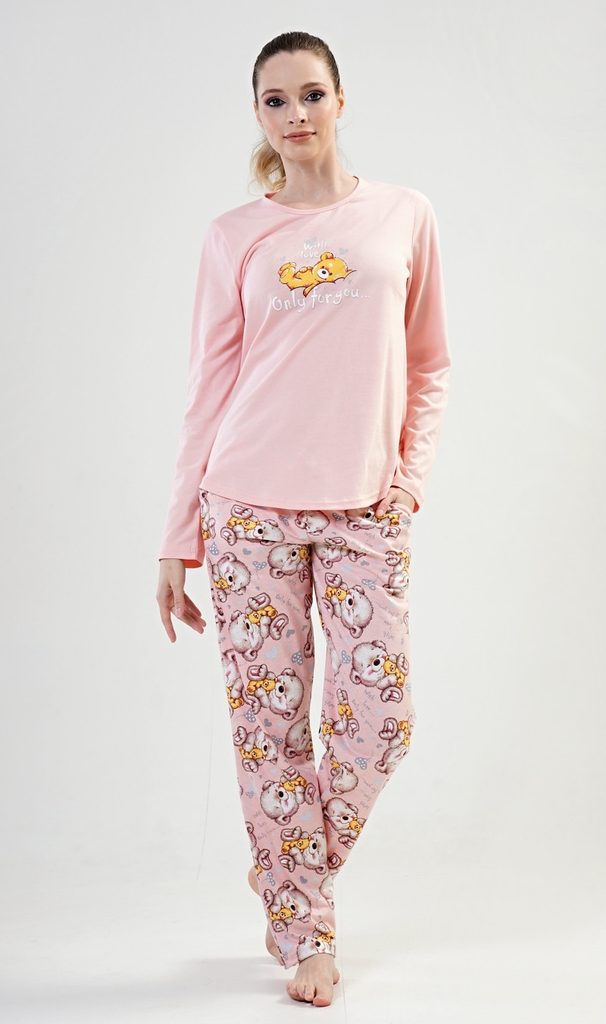 Dámské bavlněné pyžamo dlouhé Only for you. Dámské pyžamo se skládá z trička s dlouhým rukávem a dlouhých kalhot. Triko je jednobarevné, zdobené potiskem ležícího plyšového medvěda a nápisem Only for you. Kalhoty jsou světle lososové, potištěné plyšovými medvědy. Kalhoty jsou do gumy, na stažení šňůrkou a mají kapsy. Použitý materiál je poddajný a jemný na dotek.