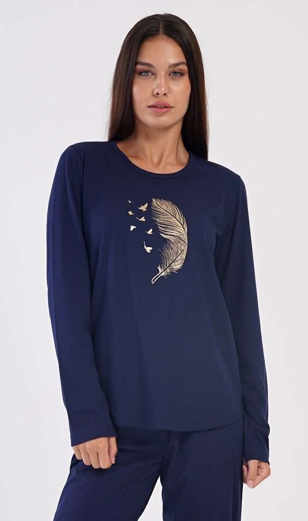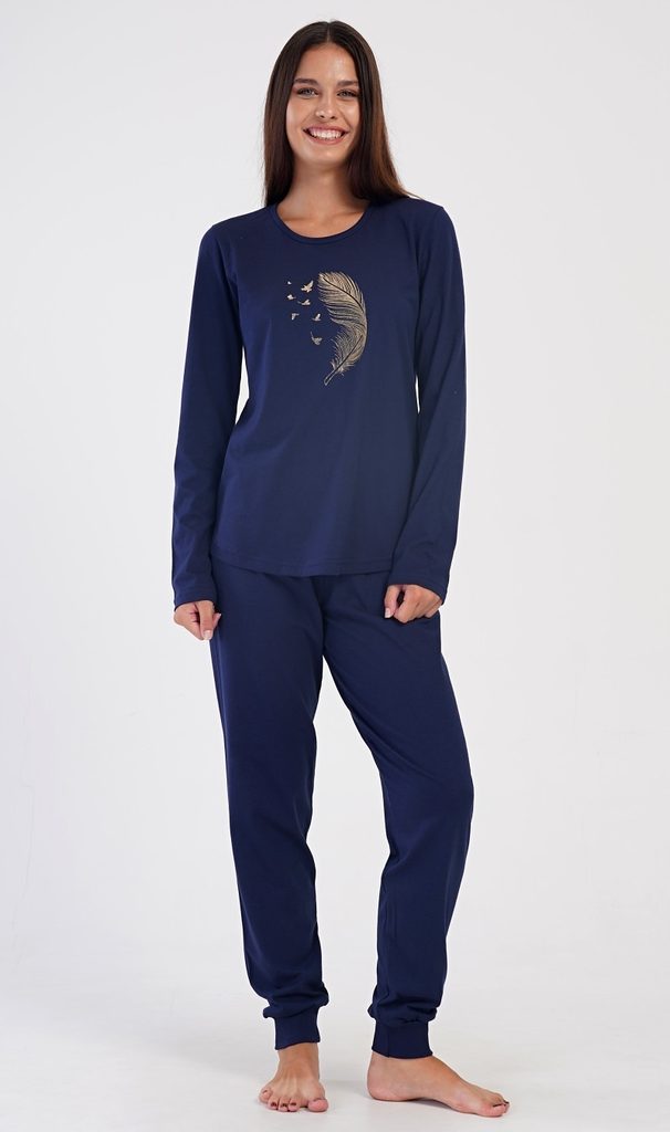 Dámské bavlněné dlouhé pyžamo Pírko. Dámské pyžamo se skládá z trika s dlouhým rukávem a dlouhých kalhot. Triko je jednobarevné, zdobené obrázkem pírka ve zlaté barvě. Pyžamové dlouhé kalhoty mají v pase gumu a šňůrku na stažení, nemají kapsy. Nohavice jsou zakončeny patenty. Použitý bavlněný materiál je poddajný a příjemný na dotek.