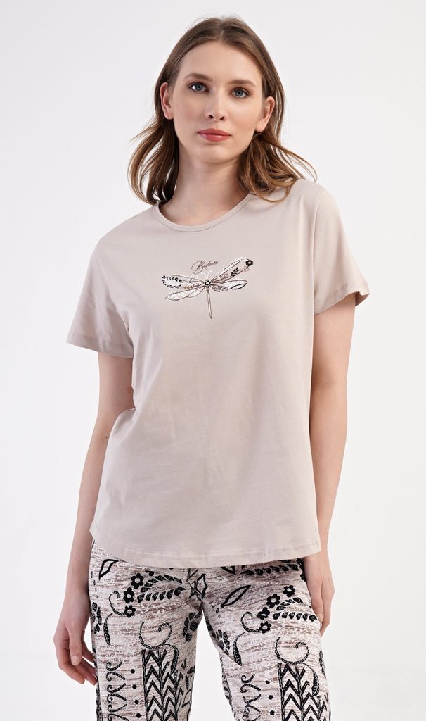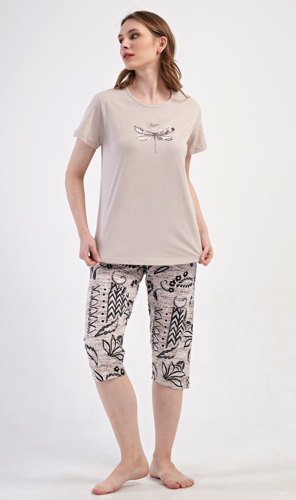 Dámské bavlněné kapri pyžamo Elena. Dámské pyžamo se skládá z trička s krátkým rukávem a tříčtvrtečních kalhot. Tričko s kulatým výstřihem zdobí na hrudi obrázek vážky. Kalhoty s potiskem listů a květů mají v pase gumu a šňůrku na stažení, jsou bez kapes. Použitý bavlněný materiál je příjemný a poddajný na dotek.