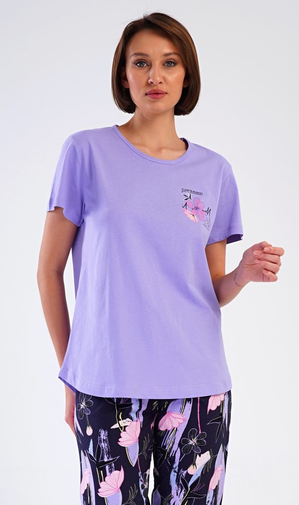 Dámské bavlněné kapri pyžamo Flowers. Dámské pyžamo se skládá z trička s krátkým rukávem a tříčtvrtečních kalhot. Tričko s kulatým výstřihem má na hrudi obrázek květu. Tento motiv se opakuje i na kalhotách, které mají v pase gumu a šňůrku na stažení, jsou bez kapes. Použitý bavlněný materiál je příjemný a poddajný na dotek.