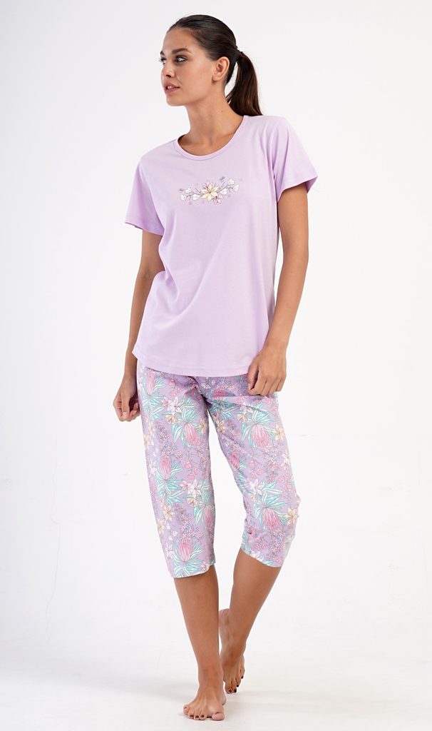 Dámské bavlněné kapri pyžamo Viola. Dámské pyžamo se skládá z trička s krátkým rukávem a tříčtvrtečních kalhot. Tričko s kulatým výstřihem má na hrudi obrázek květů. Tento motiv se opakuje i na kalhotách, které mají v pase gumu a šňůrku na stažení, jsou bez kapes. Použitý bavlněný materiál je příjemný a poddajný na dotek.