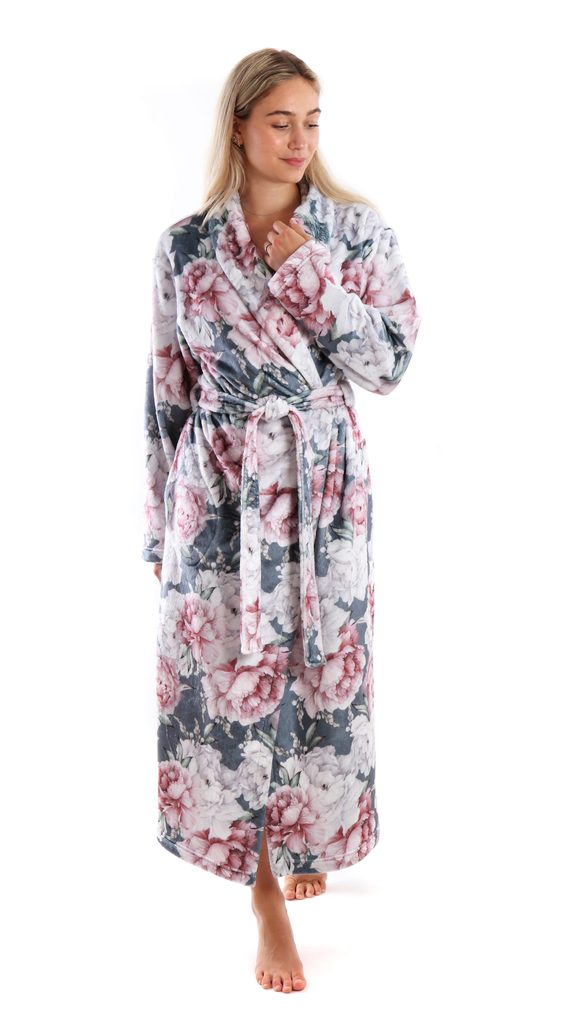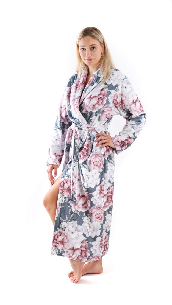 Květinová elegance. Sametově jemné květy pivoněk na hedvábném flanelovém fleecu. Lehký, dlouhý dámský župan s pohodlným střihem, šálovým límcem, bočními kapsami a páskem na převázaní. Z kolekce Secret Garden, která vás zavede do tajemného ráje přírody.