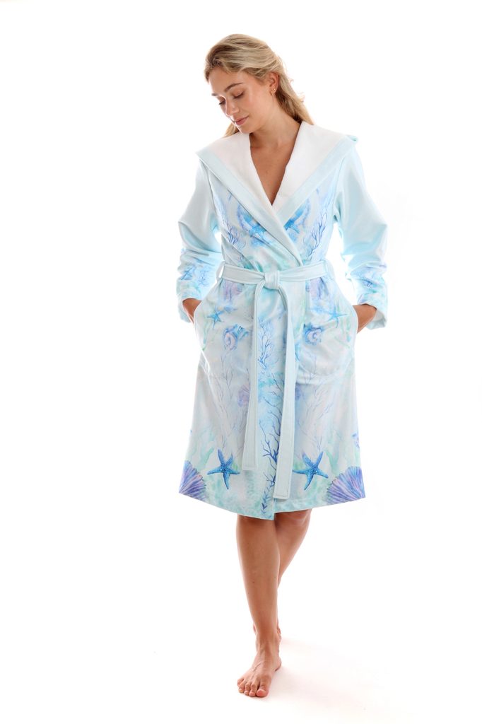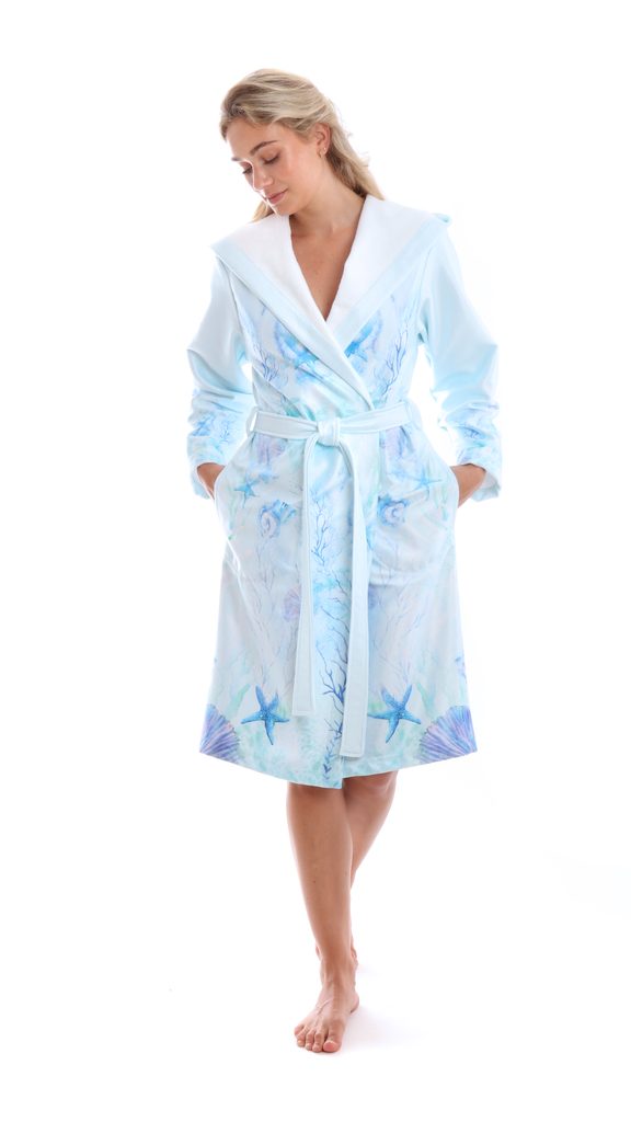 Župan Anju - Ponořte se pod hladinu. Užijte si klidný podmořský svět v tomto novém županu, který vás přenese pod vodu a nabídne vám relaxaci po osvěžující koupeli. Pohodlná délka 105 cm je k dispozici ve velikostech S, M, L a XL.