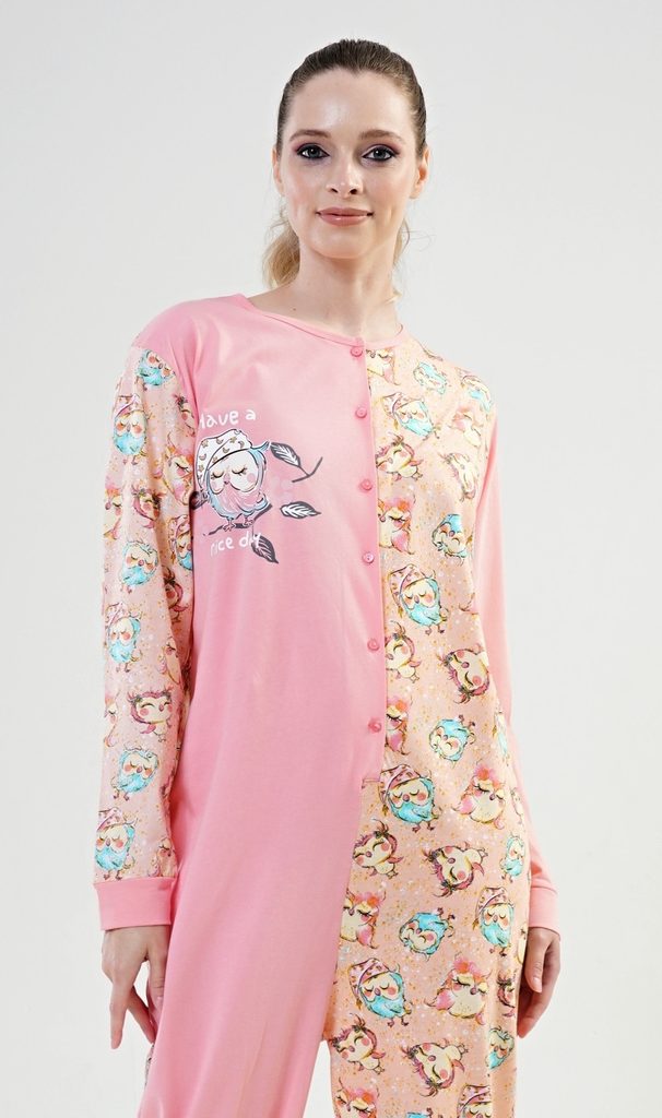 Dámský bavlněný overal Sovičky. Dámský celopropínací overal na knoflíky s motivem soviček. Použitý materiál je jemný a poddajný na dotek.
