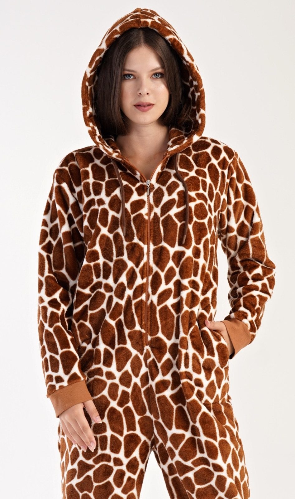 Dámský softový overal Žirafa. Overal má kapuci, zapínání na zip a praktické kapsy. Kalhoty a rukávy jsou zakončeny lemy. Zaujme výrazným žirafím vzorem. Použitý softový materiál je hřejivý a poddajný na dotek, je vhodný i jako domácí oblečení, obzvlášť ho oceníte v chladných zimních dnech.