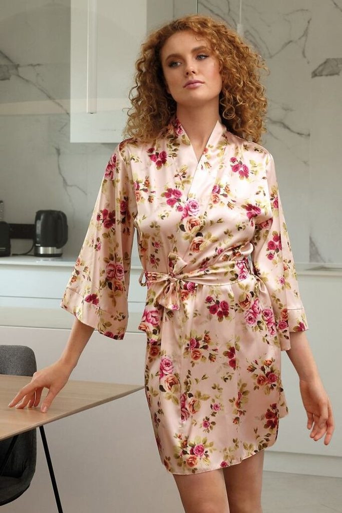 Saténový župan s jemným květinovým vzorem v délce cca 90 cm. Saténový župan s jemným květinovým vzorem v délce cca 90 cm. Materiál: 100% polyester (satén)
