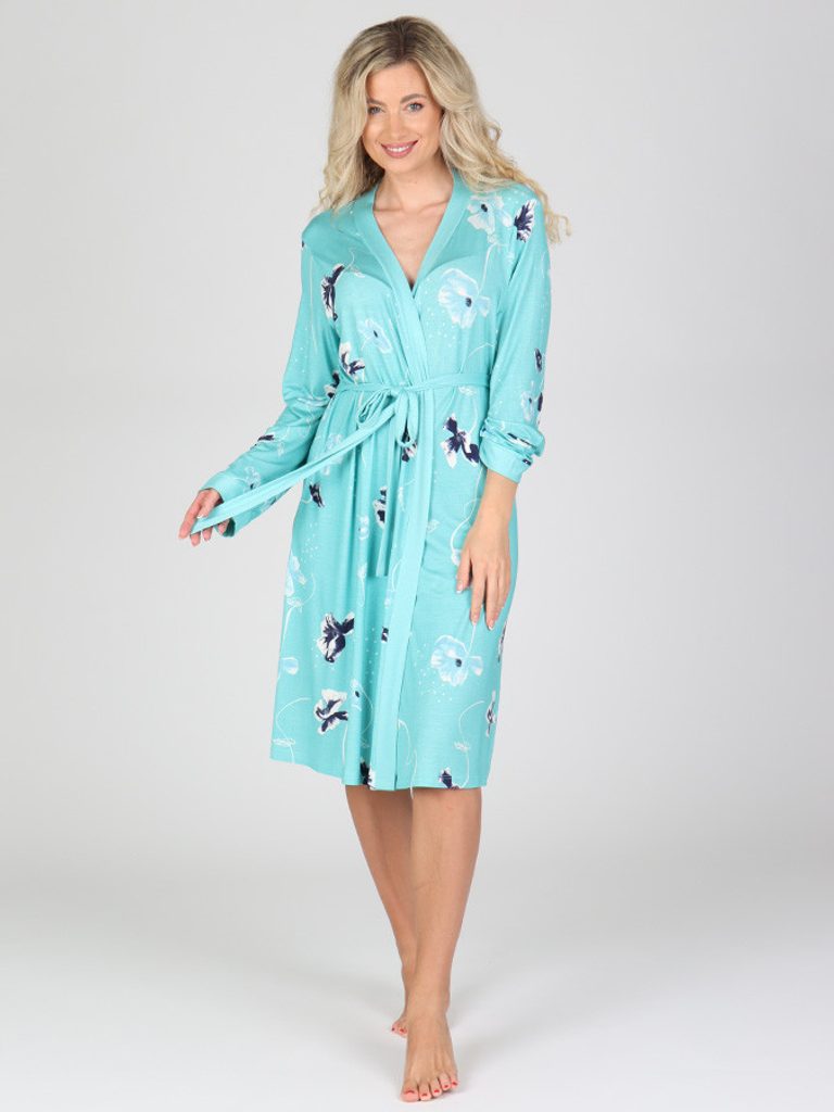 Krásný lehký dámský župan GIONA s jemným potiskem květů je klasického zavinovanícho střihu, kratší délky, s dlouhým rukávem a vázačkou v pase.