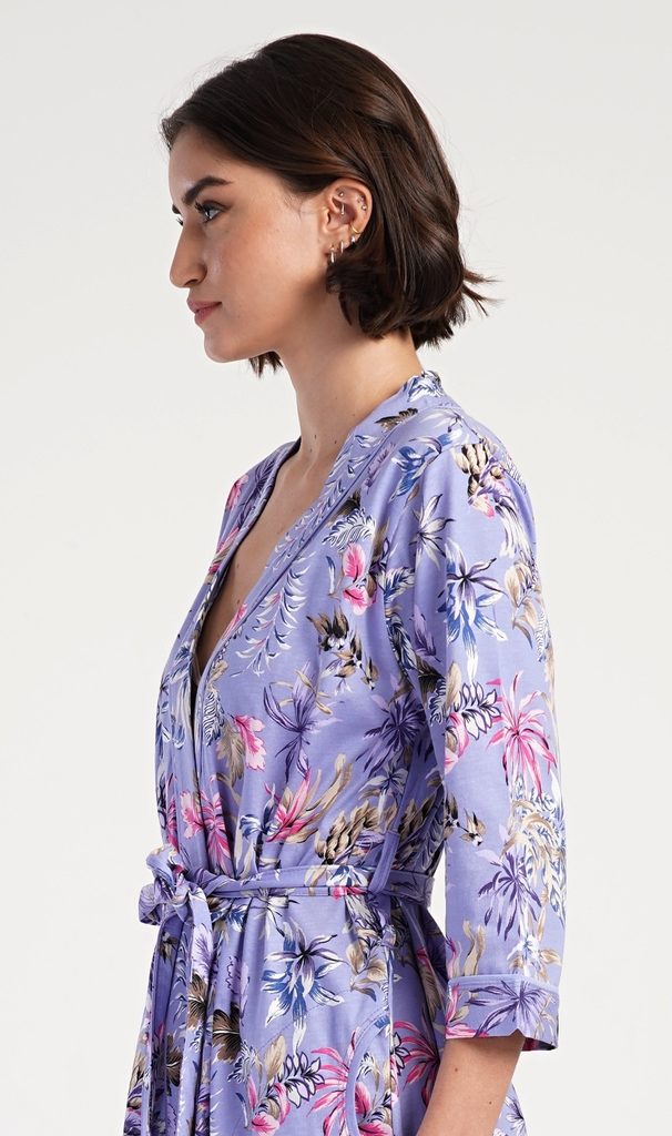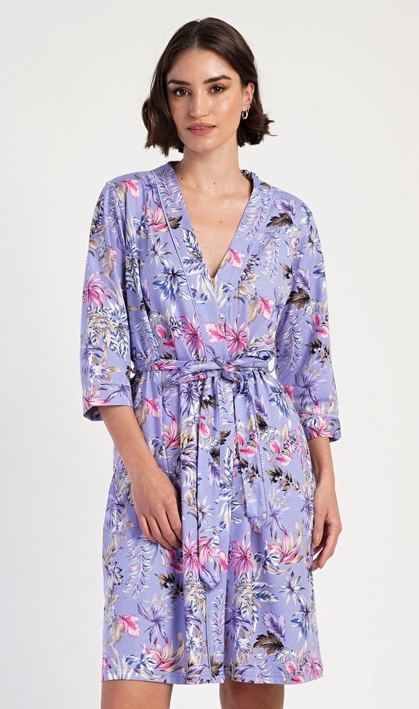 Dámský krátký bavlněný župan Alžběta. Dámský župánek v délce po kolena je potišten exotickými květy. Župan má pásek ke stažení a praktické kapsy. Použitý bavlněný materiál je příjemný a poddajný na dotek, saje a oceníte ho i při koupání venku.