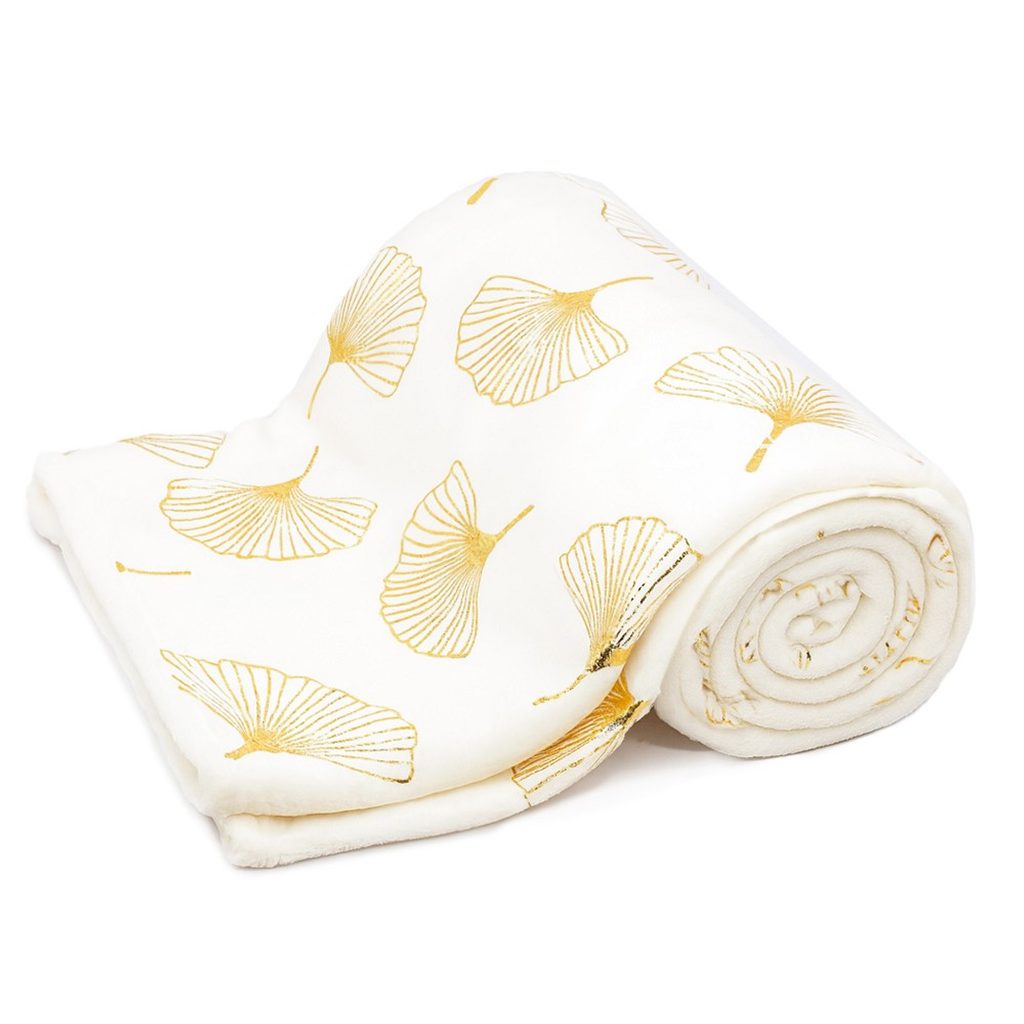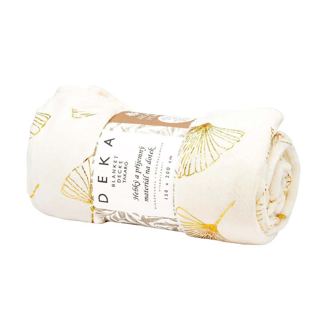 Vneste do interiéru přírodní eleganci s hebkou mikroplyšovou dekou bílé barvy, kterou zdobí zlaté listy ginkga. Jemný botanický motiv působí vzdušně a neobvykle, takže skvěle ladí s moderním, skandi i glamour stylem. Sametově hladké mikrovlákno je příjemné na dotek, hřejivé a přitom lehké – ideální na každodenní relax na gauči i jako dekorativní přehoz do ložnice.