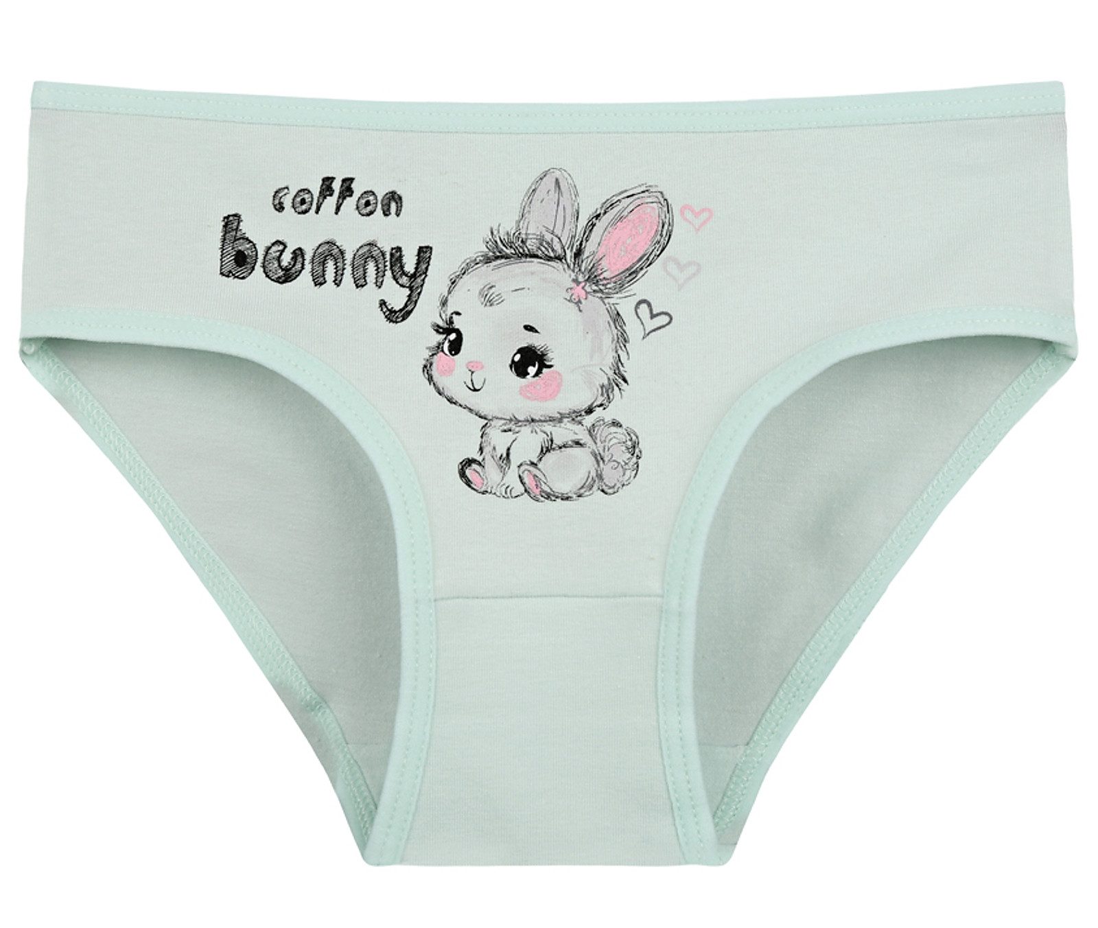 Dětské bavlněné kalhotky Bunny. Dětské kalhotky klasického střihu jsou pohodlné a slušivé, zdobí je obrázek malého králíčka a nápis 'cotton bunny'. Obzvláště oceníte materiálové složení - 95% bavlna a 5% elasten. Použitý materiál je příjemný a poddajný na dotek.