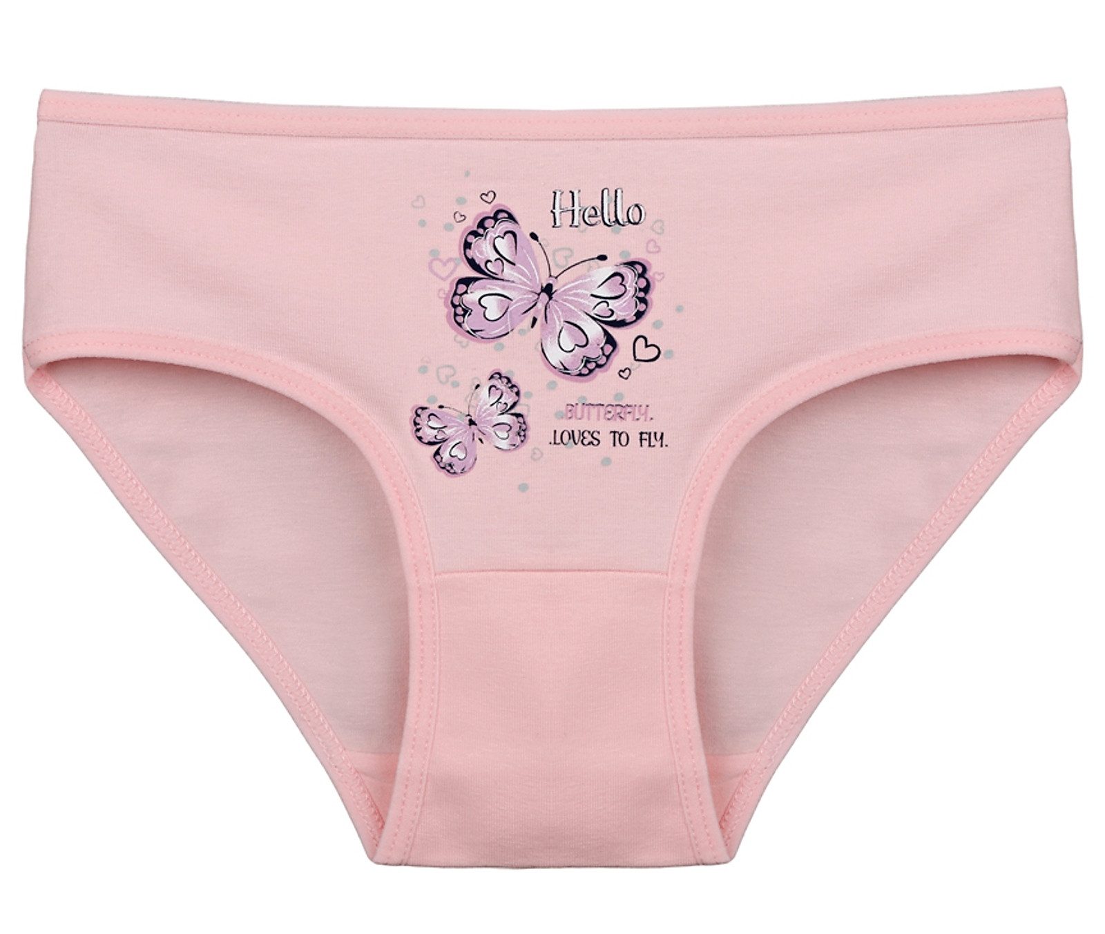 Dětské bavlněné kalhotky Butterfly. Dětské kalhotky klasického střihu jsou pohodlné a slušivé, zdobí je obrázek motýlků. Obzvláště oceníte materiálové složení - 95% bavlna a 5% elasten. Použitý materiál je příjemný a poddajný na dotek.