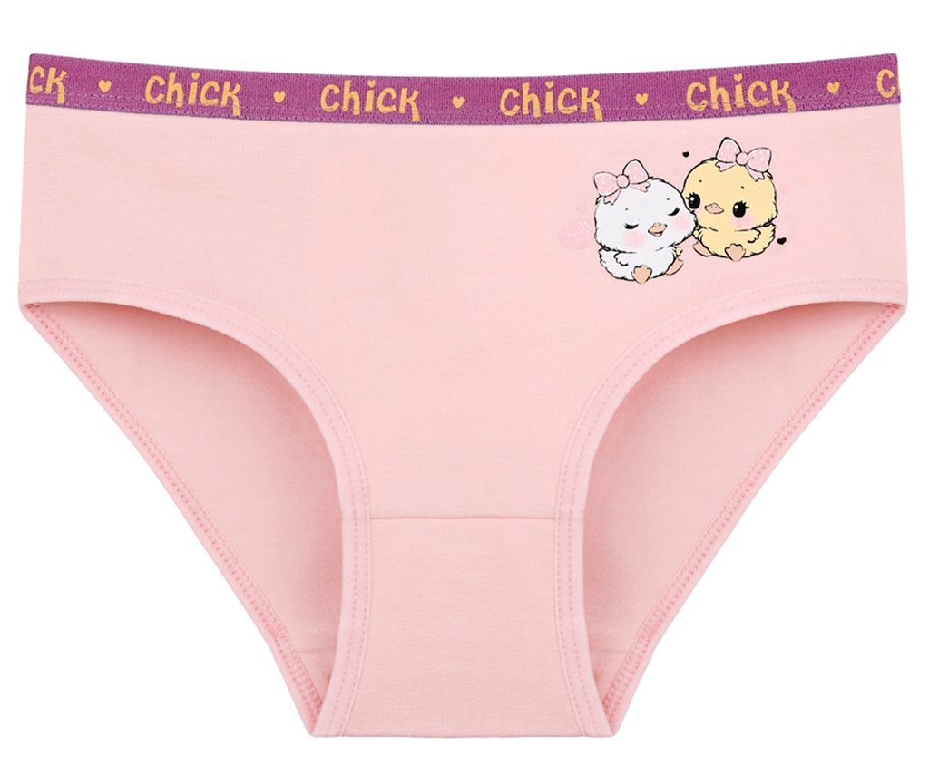 Dětské bavlněné kalhotky Kuře. Dětské kalhotky klasického střihu jsou pohodlné a slušivé, zdobí je obrázek kuřete. Obzvláště oceníte materiálové složení - 95% bavlna a 5% elasten. Použitý materiál je příjemný a poddajný na dotek.