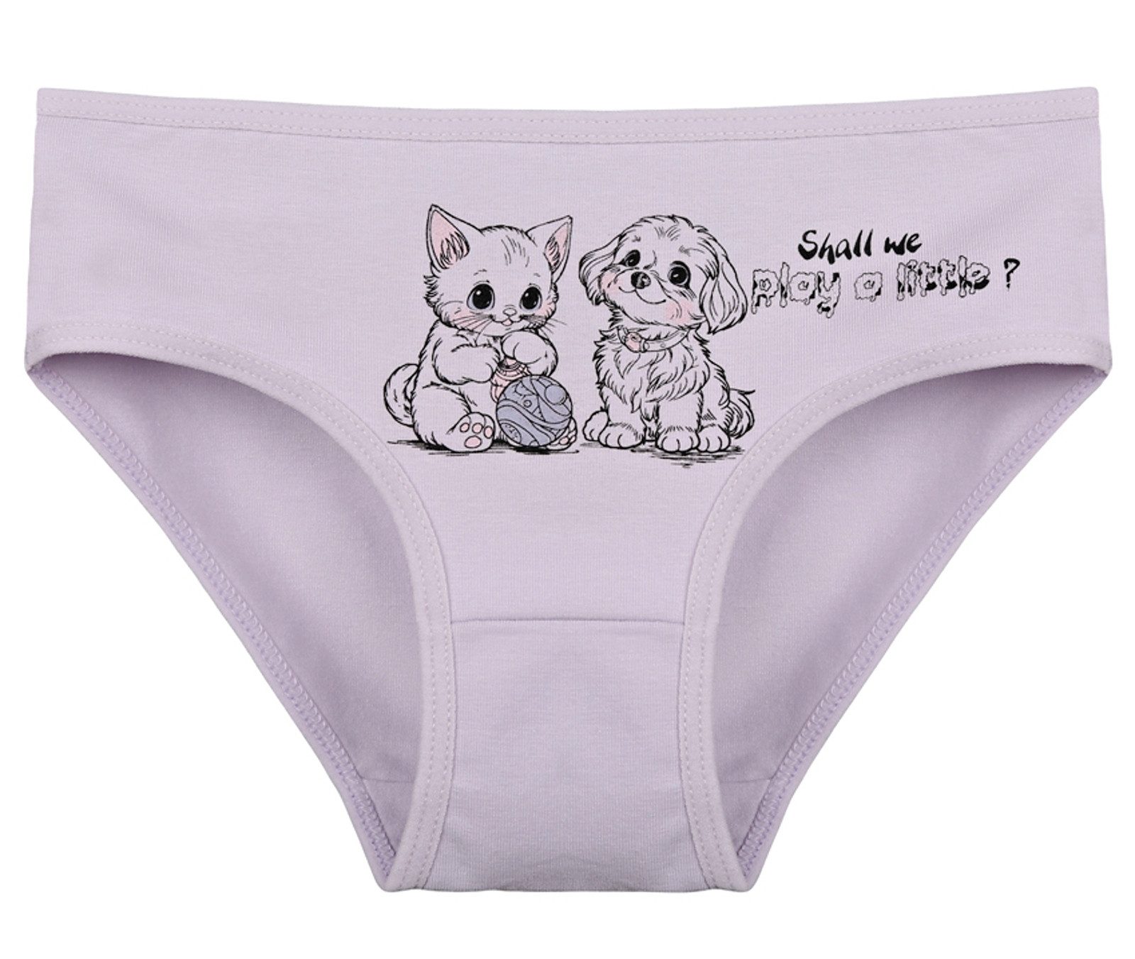 Dětské bavlněné kalhotky Olivia. Dětské kalhotky klasického střihu jsou pohodlné a slušivé, zdobí je obrázek kotěte se štěňátkem. Obzvláště oceníte materiálové složení - 95% bavlna a 5% elasten. Použitý materiál je příjemný a poddajný na dotek.