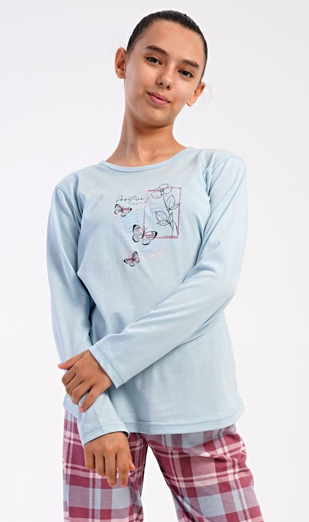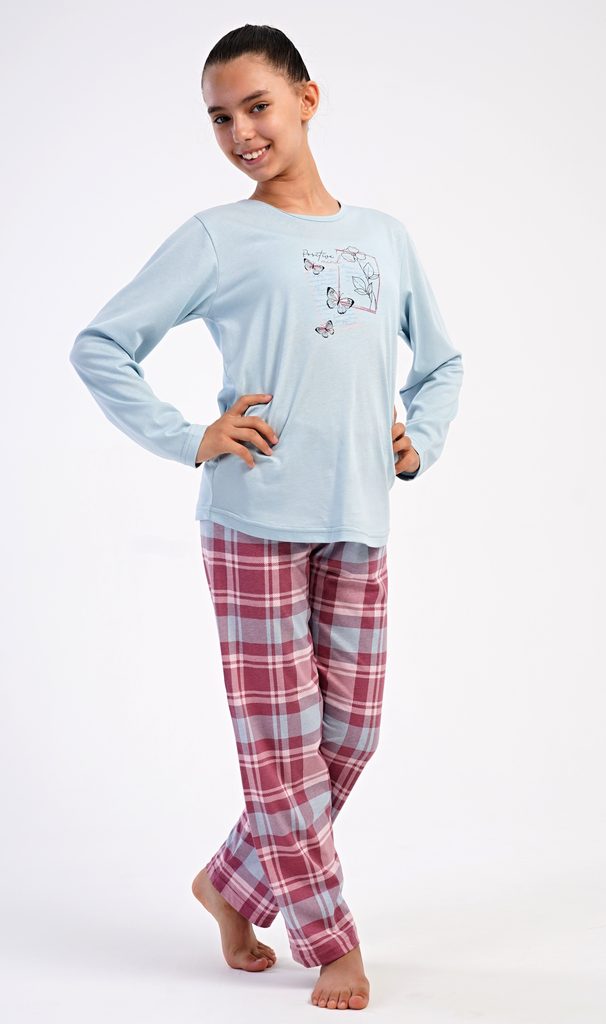 Dětské bavlněné dlouhé pyžamo Charlotte. Dívčí pyžamo se skládá z trika s dlouhým rukávem a dlouhých kalhot. Triko s kulatým výstřihem je ozdobeno obrázky motýlů. Kárované kalhoty mají v pase gumu a šňůrku na stažení, nemají kapsy. Použitý bavlněný materiál je poddajný a příjemný na dotek.