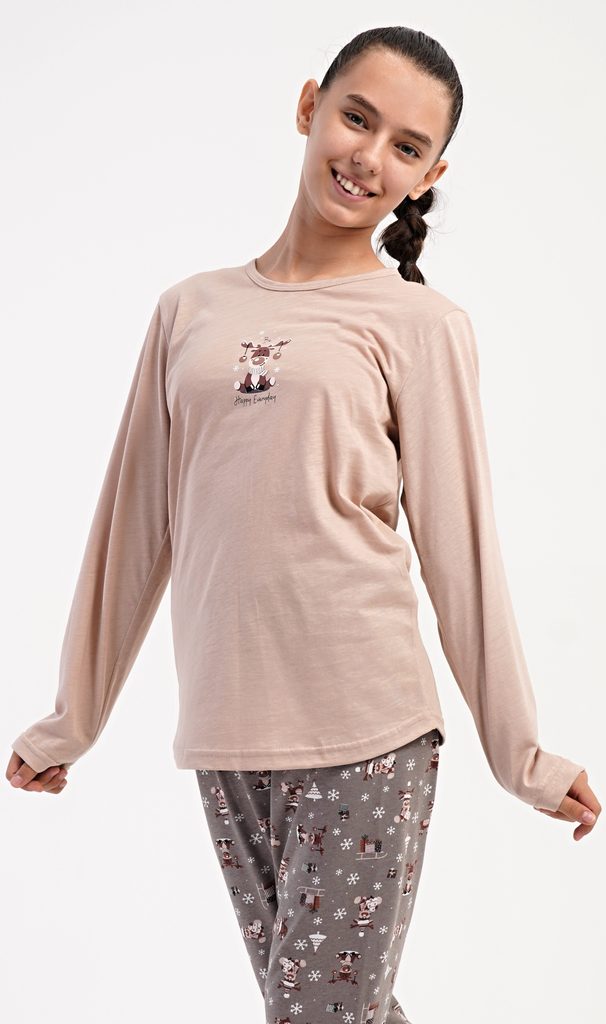 Dětské bavlněné dlouhé pyžamo Sobík. Dívčí pyžamo se skládá z trika s dlouhým rukávem a dlouhých kalhot. Triko s kulatým výstřihem je ozdobeno obrázkem malého vánočního soba. Tento motiv se opakuje i na kalhotách, které mají v pase gumu a šňůrku na stažení, nemají kapsy. Použitý bavlněný materiál je poddajný a příjemný na dotek.