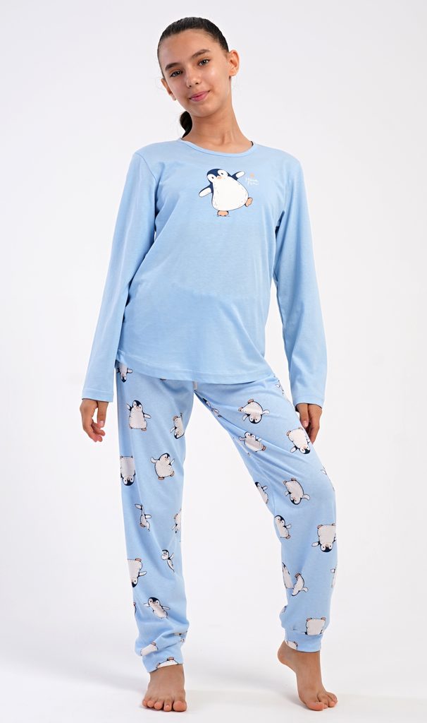 Dětské bavlněné dlouhé pyžamo Tučňák. Dívčí pyžamo se skládá z trika s dlouhým rukávem a dlouhých kalhot. Triko s kulatým výstřihem je ozdobeno obrázkem tučňáka. Tento motiv se opakuje i na kalhotách, které mají v pase gumu a šňůrku na stažení, nemají kapsy. Použitý bavlněný materiál je poddajný a příjemný na dotek.