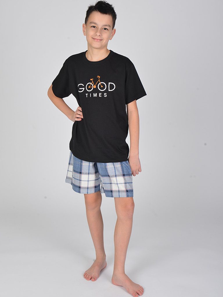 Pro příjemný spánek a dobrou noc děti potřebují spaní jako v bavlnce. Dětské pyžamo z příjemné bavlny se skládá z trika s potiskem a károvaných krátkých pyžamových kalhot.